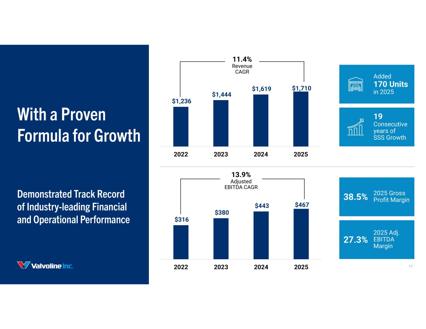 Share of Visits Fragmented 2015 2025 11.5 Y 12.8 Y Age of Car Parc Full Synthetic Mix Prioritizing Convenience 2015 2025 ~20% ~50% 77% Dealer General Repair, Tire and Retail Quick Lube Customers prioritize convenience in retail ~17,000 outlets 300,000+ outlets 10,000+ outlets In an Attractive Market 16