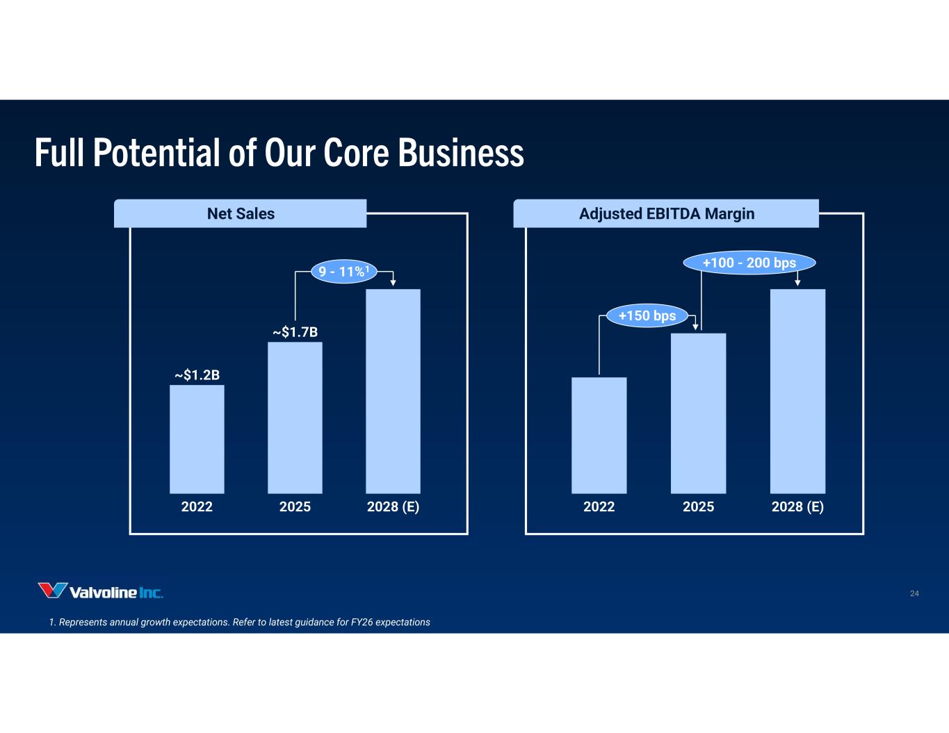 Significant Network Expansion Opportunity Remains 1,715 2,180 2022 2025 2028 (E) >2,900 2022 2025 2028 (E) ~5% ~6% 7 - 8% 2022 2025 2028 (E) 35% 42% > 50% Number of Stores Market Share Geographic Coverage Valvoline’s System Wide Store Footprint Share of Oil Change Market Percentage of Car Parc within 10 minutes of a Valvoline store 25