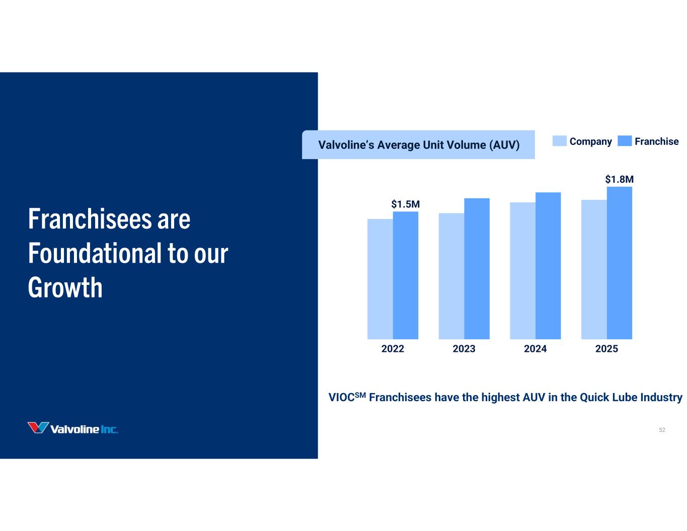 Franchisees are Foundational to our Growth 51 Valvoline Franchise Network has grown at 8% CAGR 790 876 950 1,016 925 976 1,060 1,164 2022 2023 2024 2025 Valvoline’s Network Growth Franchise Company