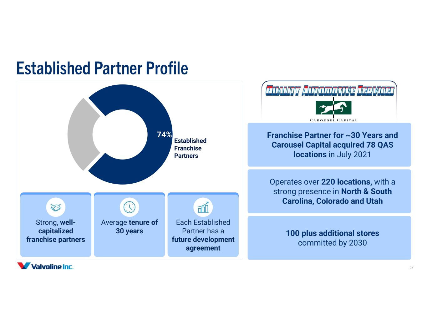 Established Partner Profile Strong, well- capitalized franchise partners Average tenure of 30 years Each Established Partner has a future development agreement Oldest Valvoline franchise partner ~100 additional stores committed by 2030 Operates over 260 locations, with a strong presence in New England, Florida and California 74% Established Franchise Partners Remaining Franchise Partners 56