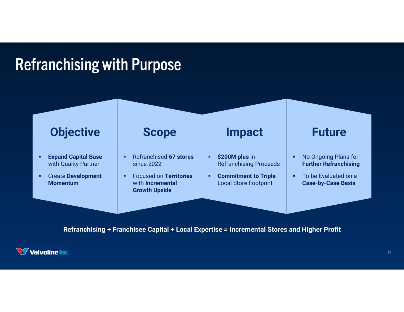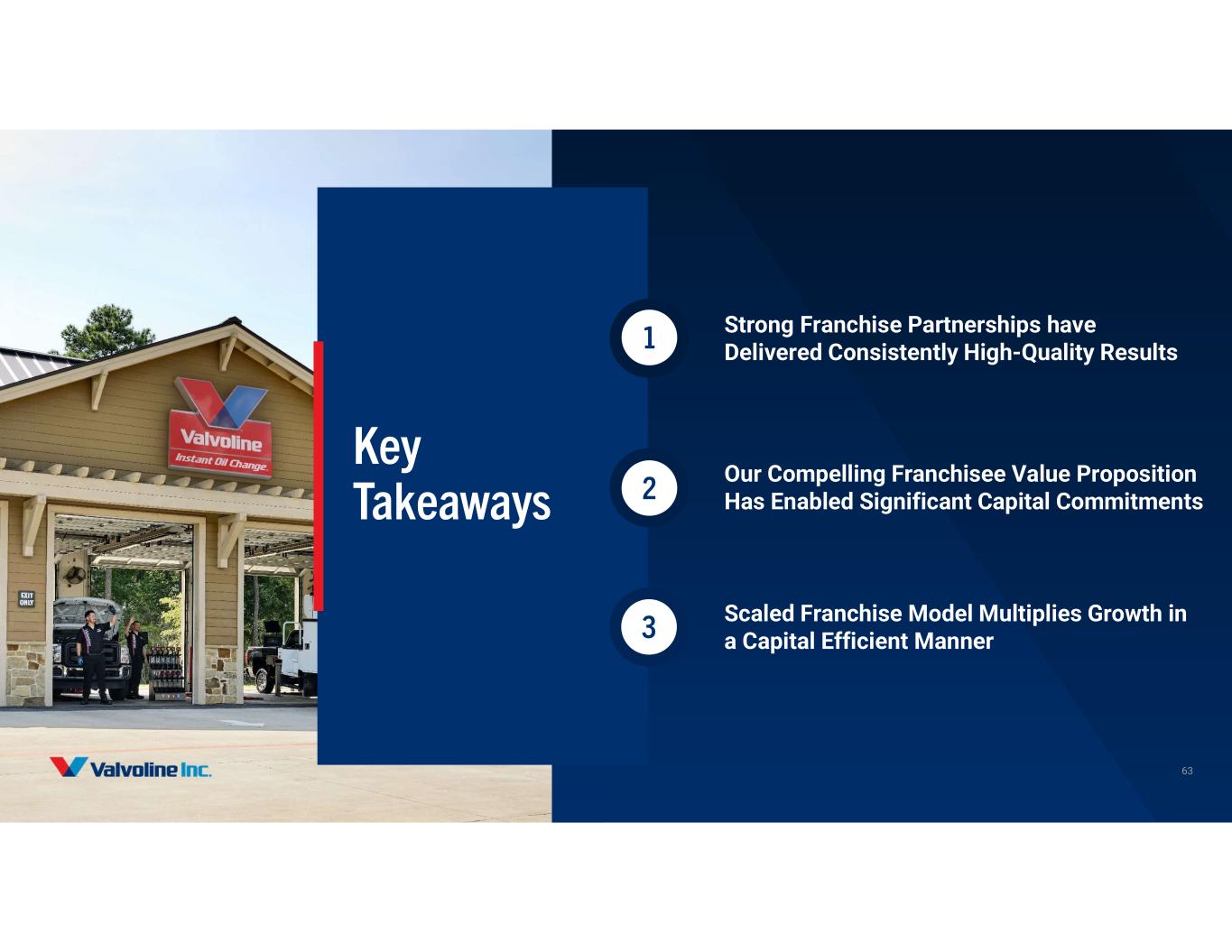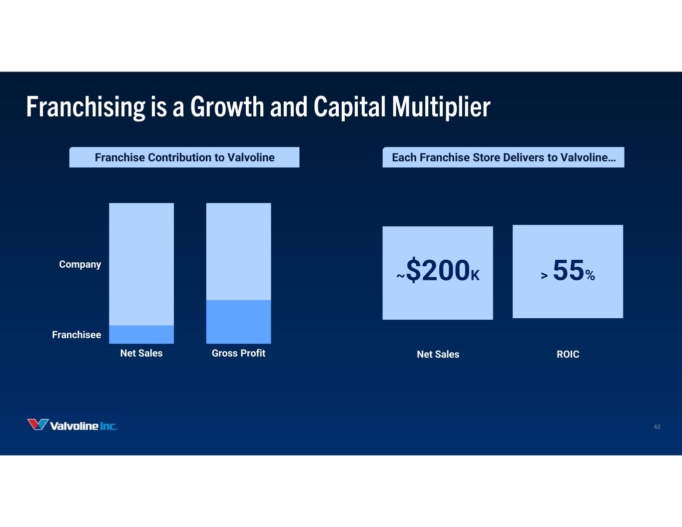 Franchising is a Growth and Capital Multiplier Franchise Contribution to Valvoline Each Franchise Store Delivers to Valvoline… Net Sales Gross Profit Franchisee Company Net Sales ~$200K 62 > 55% ROIC