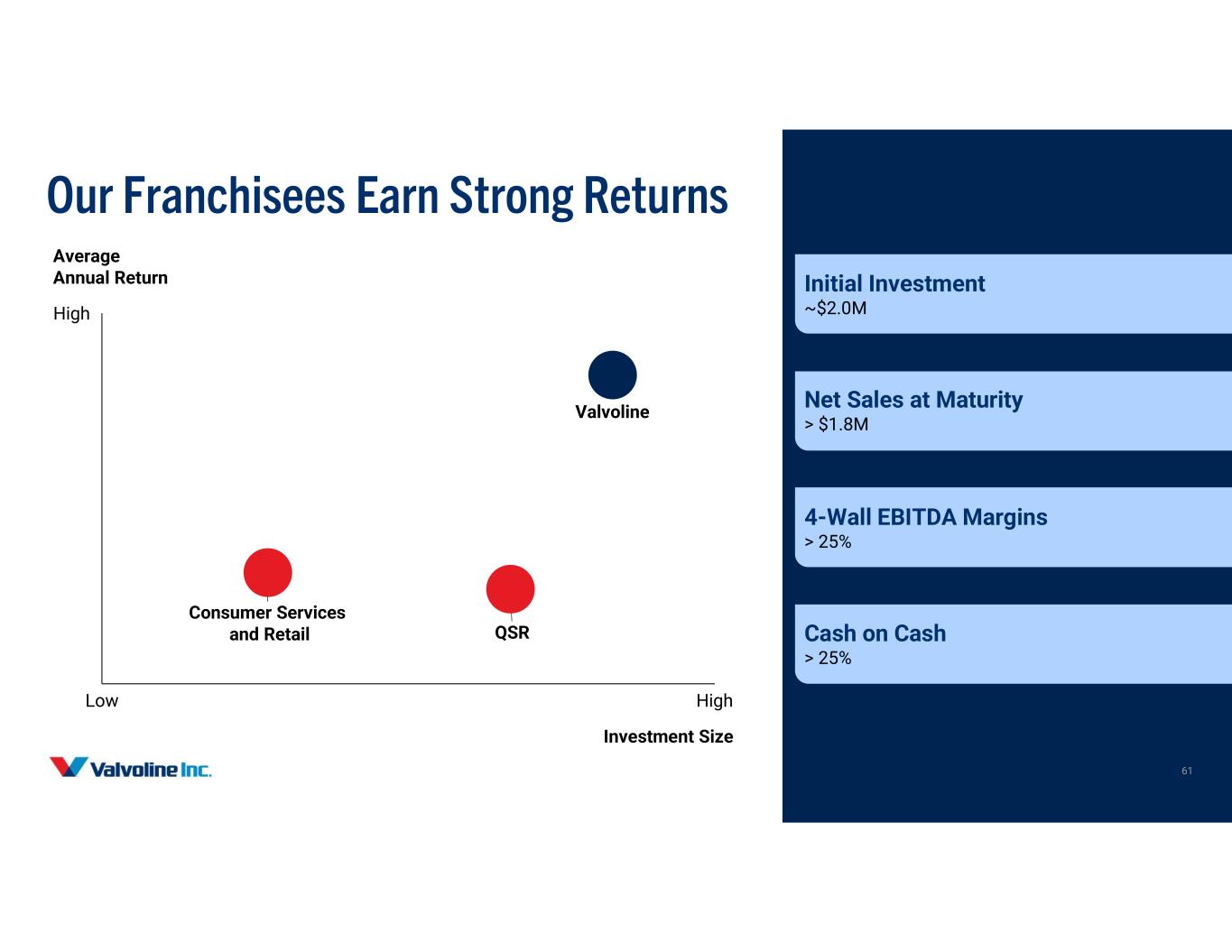 Our Franchisees Earn Strong Returns Initial Investment ~$2.0M Net Sales at Maturity > $1.8M 4-Wall EBITDA Margins > 25% Cash on Cash > 25% Low High High Investment Size Average Annual Return Valvoline QSR Consumer Services and Retail 61