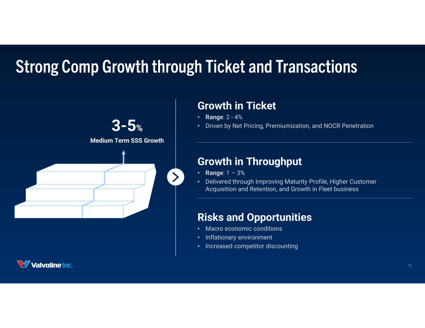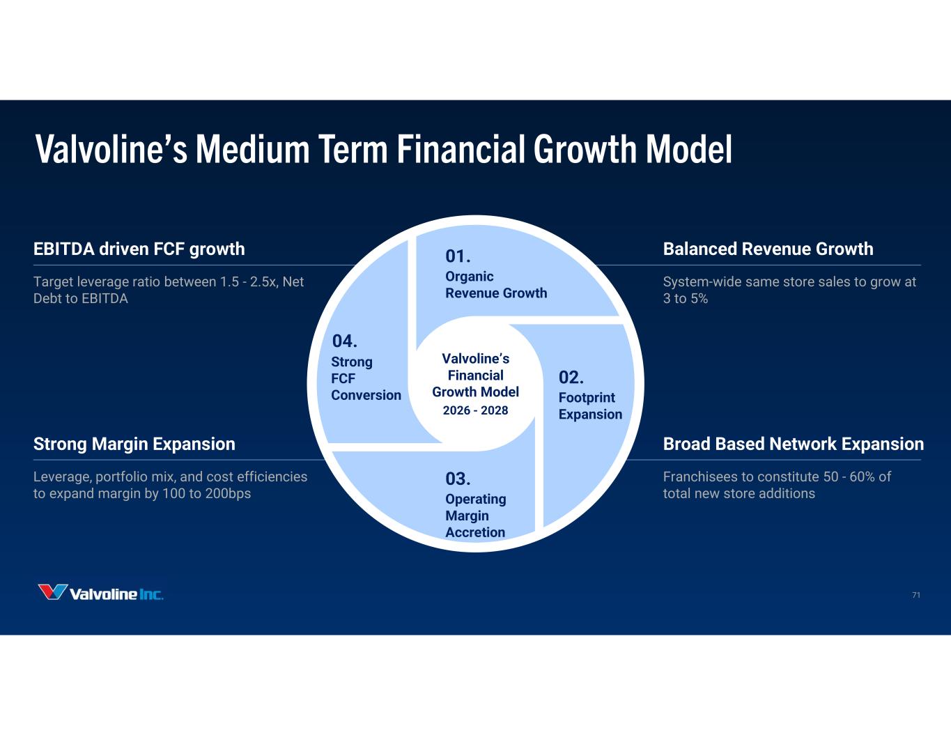 Valvoline’s Medium Term Financial Growth Model Balanced Revenue Growth System-wide same store sales to grow at 3 to 5% Broad Based Network Expansion Franchisees to constitute 50 - 60% of total new store additions Organic Revenue Growth 01. Operating Margin Accretion 03. Footprint Expansion 02. Strong FCF Conversion 04. EBITDA driven FCF growth Target leverage ratio between 1.5 - 2.5x, Net Debt to EBITDA Strong Margin Expansion Leverage, portfolio mix, and cost efficiencies to expand margin by 100 to 200bps Valvoline’s Financial Growth Model 2026 - 2028 71