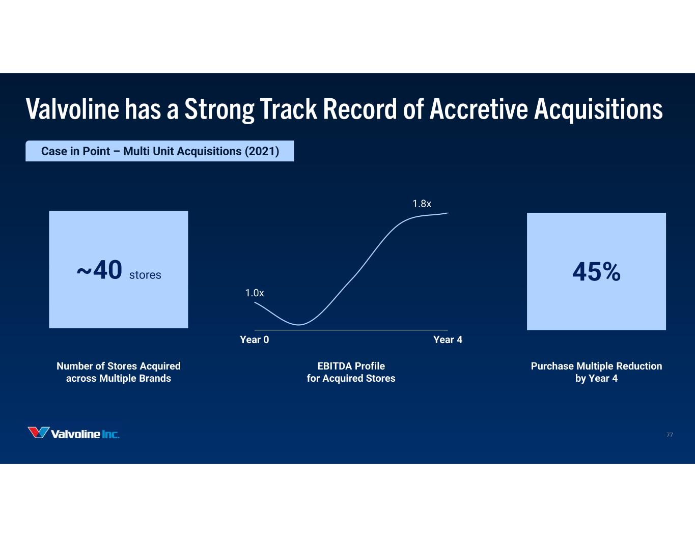 Valvoline has a Strong Track Record of Accretive Acquisitions ~40 stores Number of Stores Acquired across Multiple Brands 1.0x 1.8x Year 0 Year 4 EBITDA Profile for Acquired Stores 45% Purchase Multiple Reduction by Year 4 Case in Point – Multi Unit Acquisitions (2021) 77