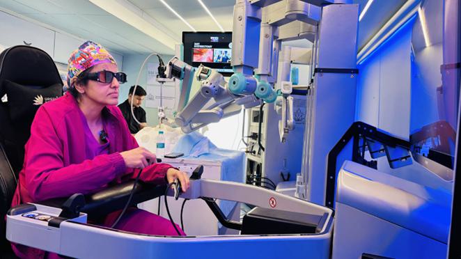 (Dr. Priya Bhave Chittawar conducting the first robotic telesurgery performed from SS Innovations’ MantraM mobile robotic telesurgery unit.)