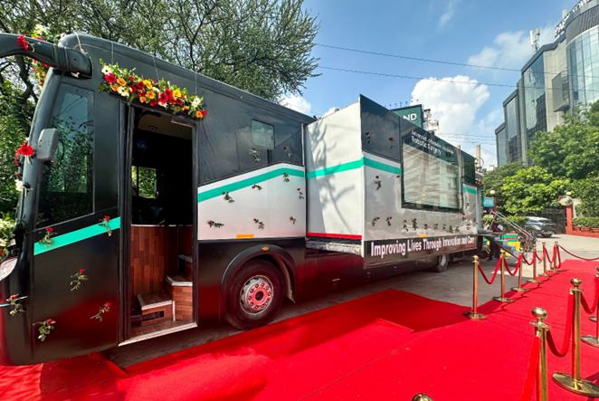 (SS Innovations’ MantraM mobile robotic telesurgery unit on a stop during its 2025 tour across India.)
