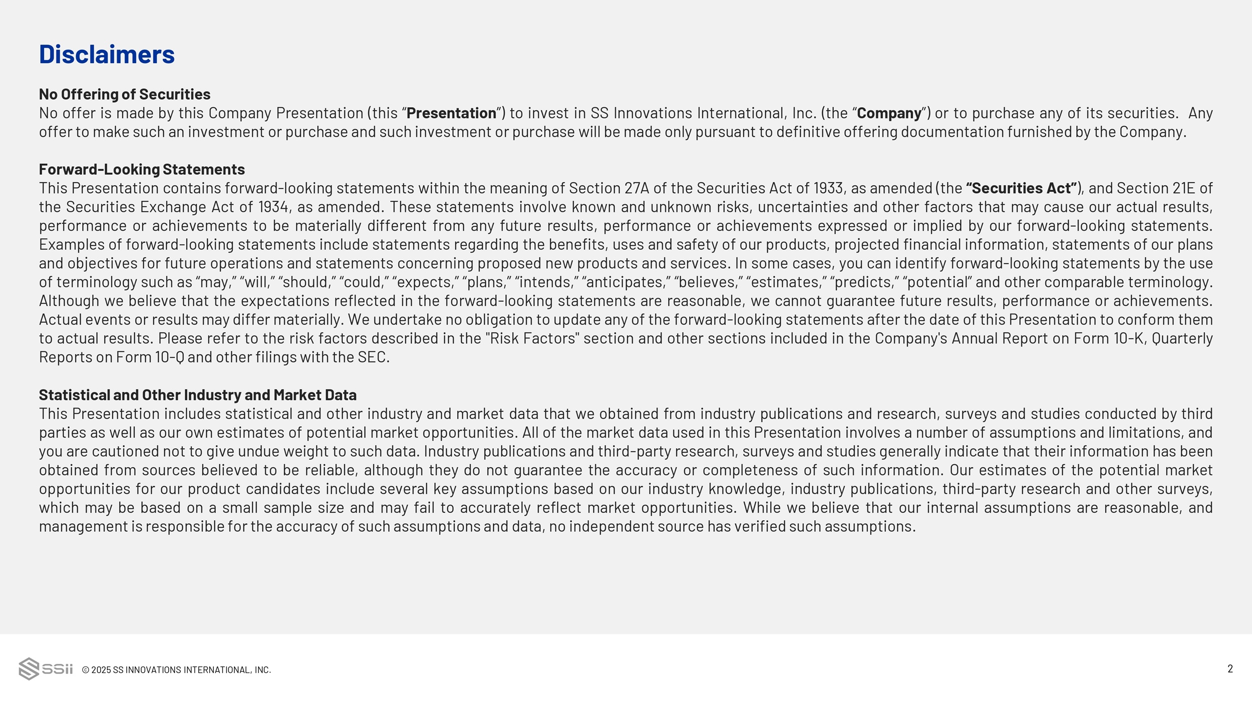 © 2025 SS INNOVATIONS INTERNATIONAL, INC. 2 No Offering of Securities No offer is made by this Company Presentation (this “ Presentation ”) to invest in SS Innovations International, Inc . (the “ Company ”) or to purchase any of its securities . Any offer to make such an investment or purchase and such investment or purchase will be made only pursuant to definitive offering documentation furnished by the Company . Forward - Looking Statements This Presentation contains forward - looking statements within the meaning of Section 27 A of the Securities Act of 1933 , as amended (the “Securities Act” ), and Section 21 E of the Securities Exchange Act of 1934 , as amended . These statements involve known and unknown risks, uncertainties and other factors that may cause our actual results, performance or achievements to be materially different from any future results, performance or achievements expressed or implied by our forward - looking statements . Examples of forward - looking statements include statements regarding the benefits, uses and safety of our products, projected financial information, statements of our plans and objectives for future operations and statements concerning proposed new products and services . In some cases, you can identify forward - looking statements by the use of terminology such as “may,” “will,” “should,” “could,” “expects,” “plans,” “intends,” “anticipates,” “believes,” “estimates,” “predicts,” “potential” and other comparable terminology . Although we believe that the expectations reflected in the forward - looking statements are reasonable, we cannot guarantee future results, performance or achievements . Actual events or results may differ materially . We undertake no obligation to update any of the forward - looking statements after the date of this Presentation to conform them to actual results . Please refer to the risk factors described in the "Risk Factors" section and other sections included in the Company's Annual Report on Form 10 - K, Quarterly Reports on Form 10 - Q and other filings with the SEC . Statistical and Other Industry and Market Data This Presentation includes statistical and other industry and market data that we obtained from industry publications and research, surveys and studies conducted by third parties as well as our own estimates of potential market opportunities . All of the market data used in this Presentation involves a number of assumptions and limitations, and you are cautioned not to give undue weight to such data . Industry publications and third - party research, surveys and studies generally indicate that their information has been obtained from sources believed to be reliable, although they do not guarantee the accuracy or completeness of such information . Our estimates of the potential market opportunities for our product candidates include several key assumptions based on our industry knowledge, industry publications, third - party research and other surveys, which may be based on a small sample size and may fail to accurately reflect market opportunities . While we believe that our internal assumptions are reasonable, and management is responsible for the accuracy of such assumptions and data, no independent source has verified such assumptions . Disclaimers