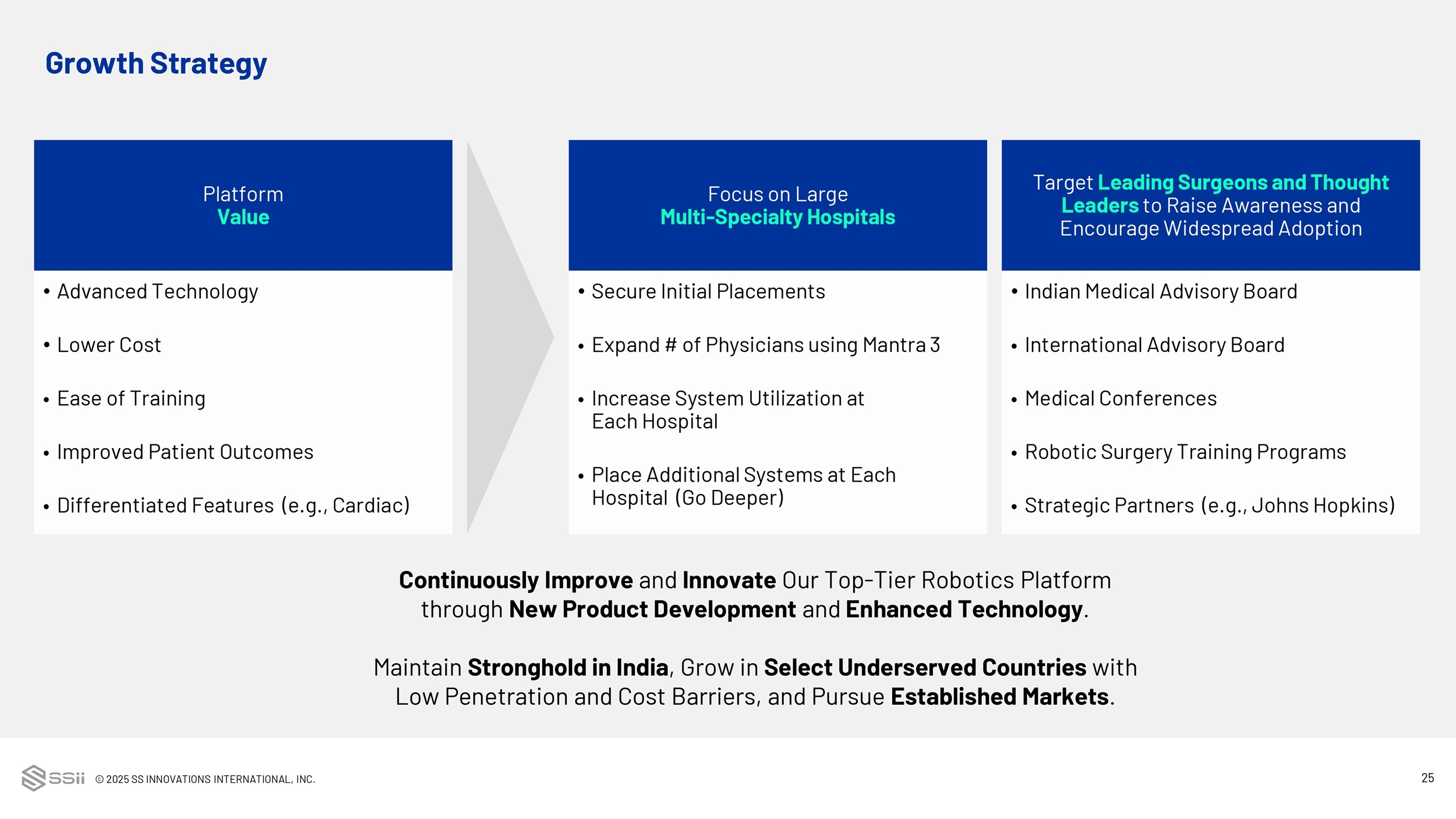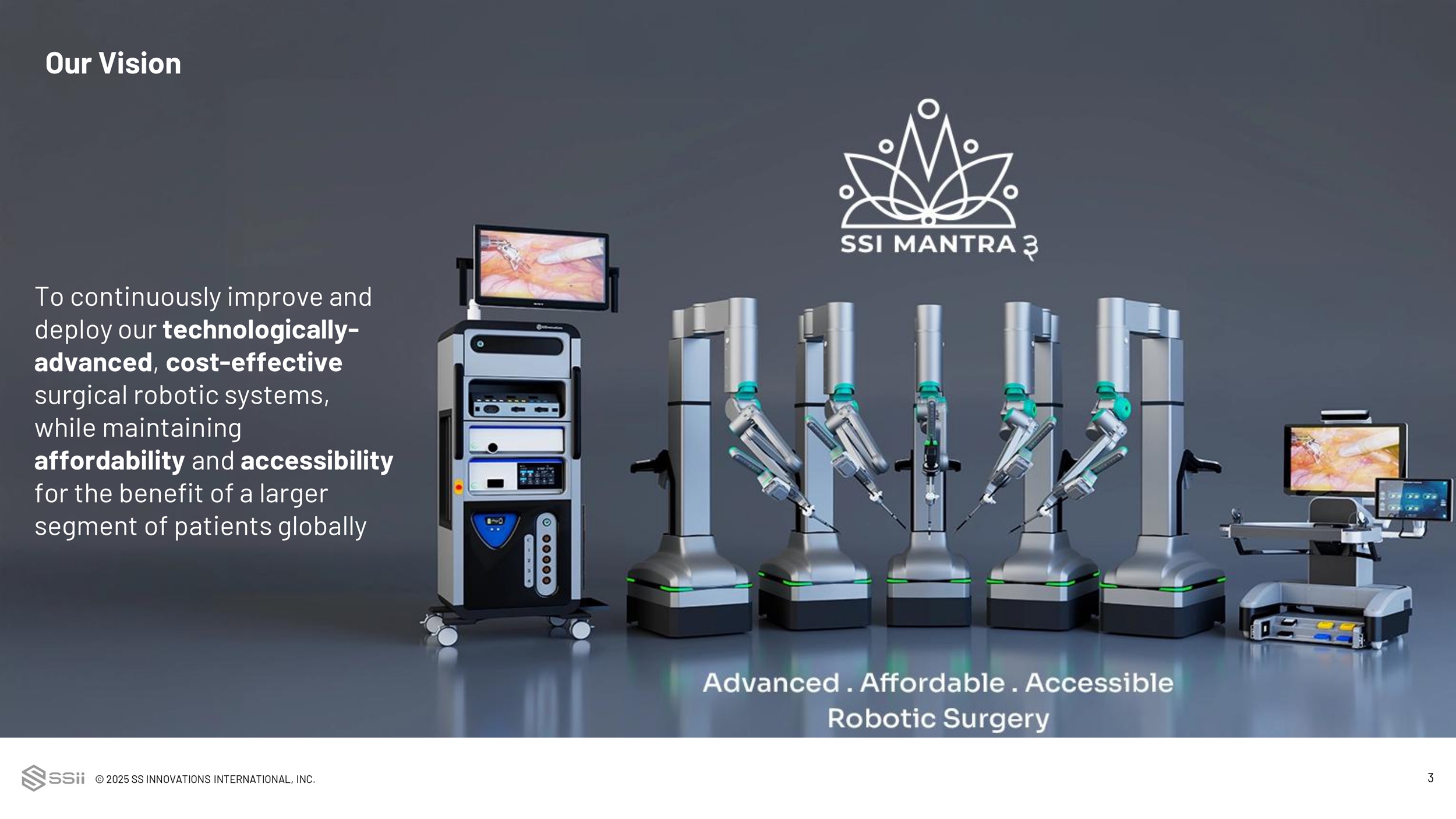 © 2025 SS INNOVATIONS INTERNATIONAL, INC. 3 Our Vision To continuously improve and deploy our technologically - advanced , cost - effective surgical robotic systems, while maintaining affordability and accessibility for the benefit of a larger segment of patients globally
