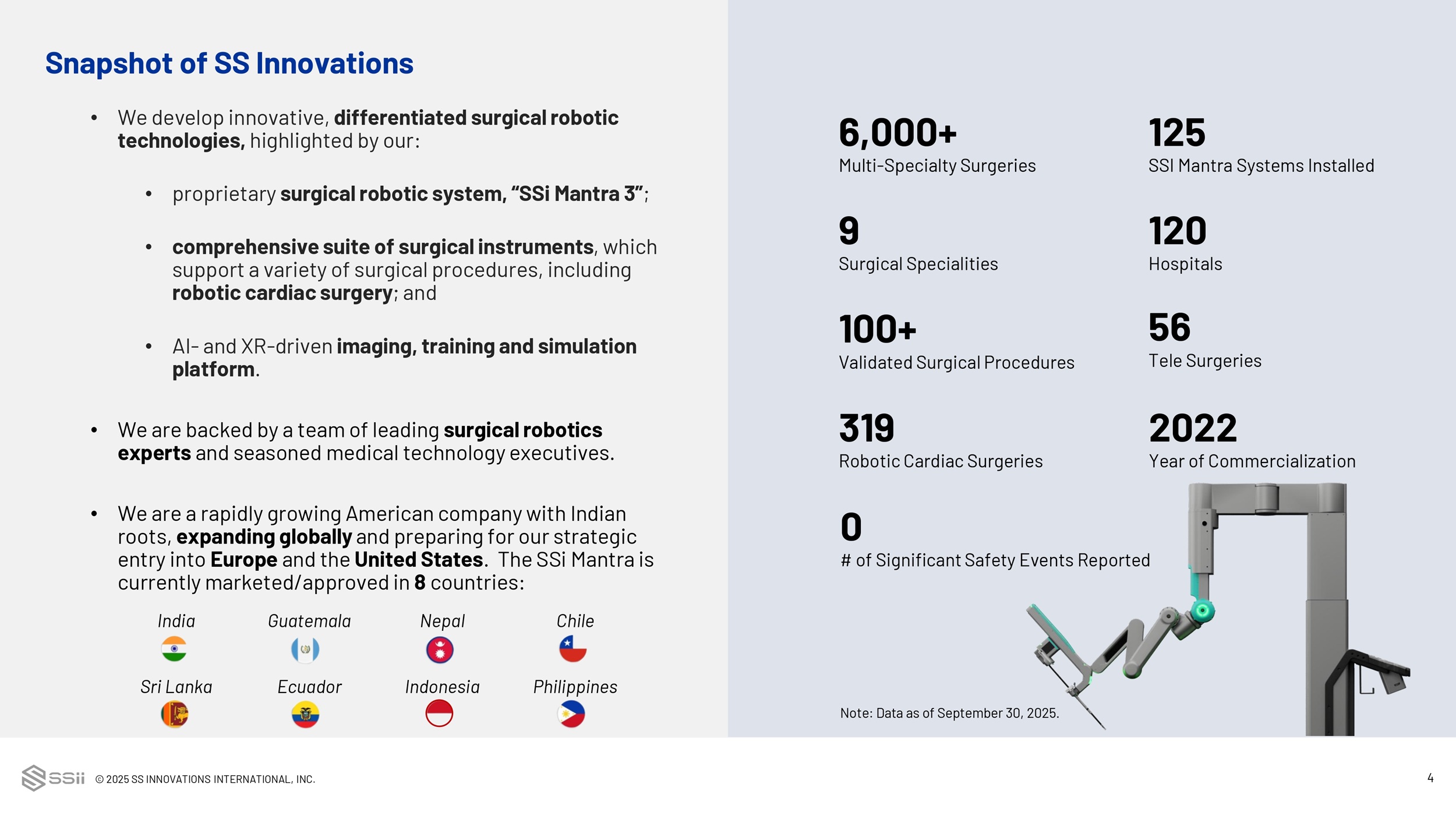 © 2025 SS INNOVATIONS INTERNATIONAL, INC. 4 Snapshot of SS Innovations • We develop innovative, differentiated surgical robotic technologies, highlighted by our: • proprietary surgical robotic system, “SSi Mantra 3” ; • comprehensive suite of surgical instruments , which support a variety of surgical procedures, including robotic cardiac surgery ; and • AI - and XR - driven imaging, training and simulation platform . • We are backed by a team of leading surgical robotics experts and seasoned medical technology executives. • We are a rapidly growing American company with Indian roots, expanding globally and preparing for our strategic entry into Europe and the United States . The SSi Mantra is currently marketed/approved in 8 countries: 6,000+ Multi - Specialty Surgeries 125 SSI Mantra Systems Installed 120 Hospitals 100+ Validated Surgical Procedures 9 Surgical Specialities 319 Robotic Cardiac Surgeries 56 Tele Surgeries 0 # of Significant Safety Events Reported Note: Data as of September 30, 2025. 2022 Year of Commercialization Chile Nepal Guatemala India Philippines Indonesia Ecuador Sri Lanka