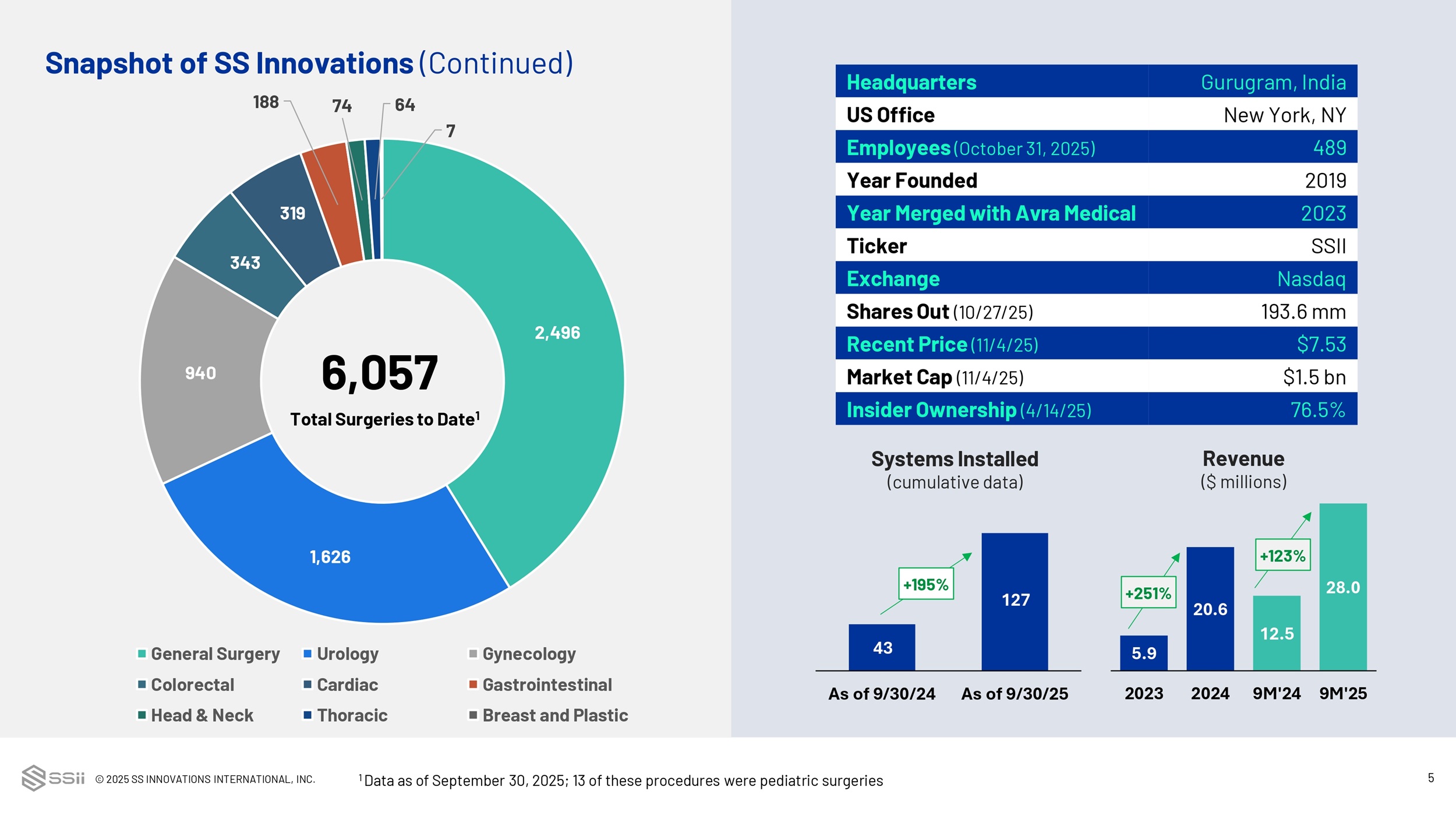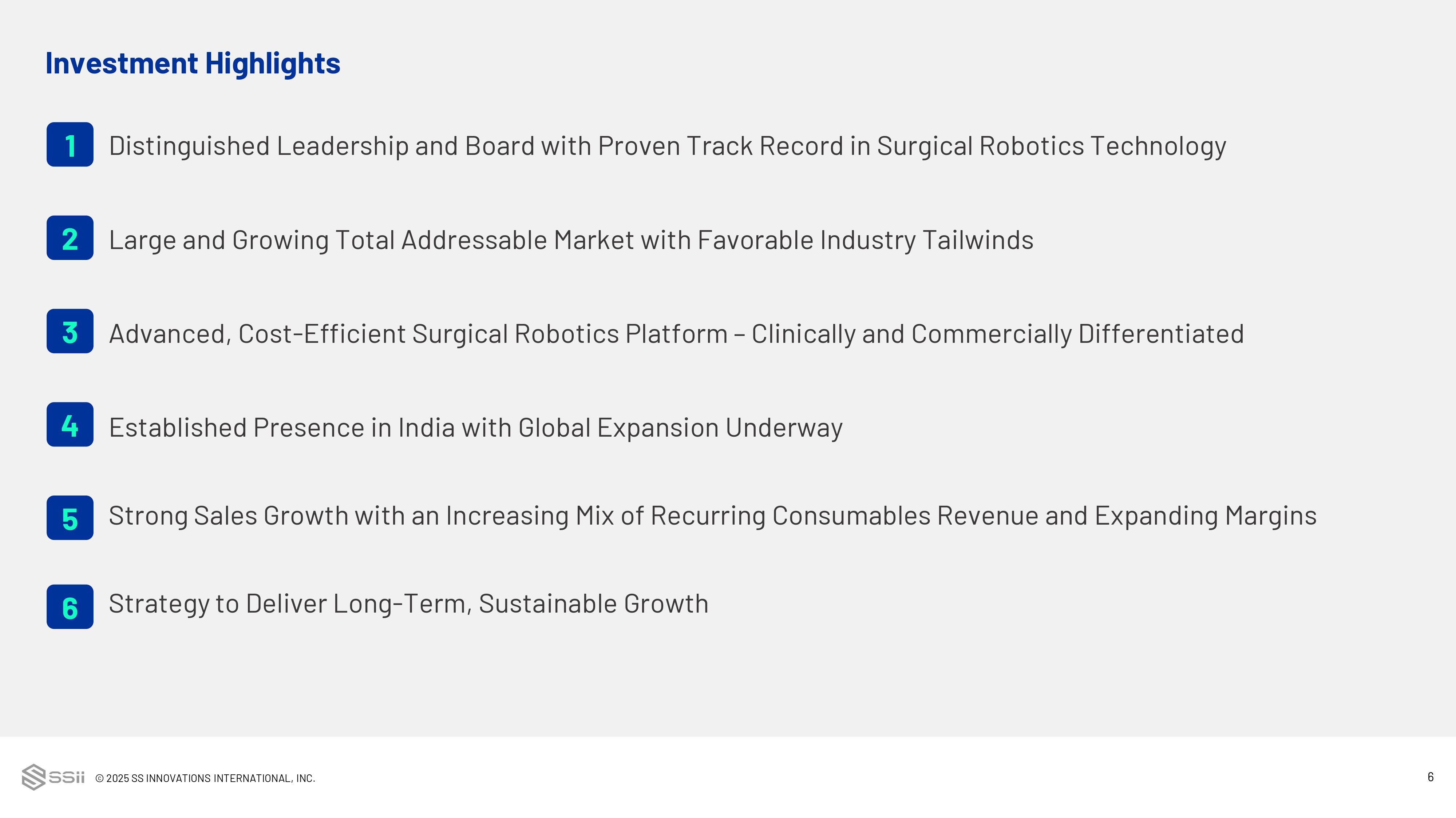 © 2025 SS INNOVATIONS INTERNATIONAL, INC. 5 Snapshot of SS Innovations (Continued) Gurugram, India Headquarters New York, NY US Office 489 Employees (October 31, 2025) 2019 Year Founded 2023 Year Merged with Avra Medical SSII Ticker Nasdaq Exchange 193.6 mm Shares Out (10/27/25) $7.53 Recent Price (11/4/25) $1.5 bn Market Cap (11/4/25) 76.5% Insider Ownership (4/14/25) 2,496 1,626 940 343 319 188 74 64 7 General Surgery Urology Gynecology Colorectal Cardiac Gastrointestinal Head & Neck Thoracic Breast and Plastic 6,057 Total Surgeries to Date 1 1 Data as of September 30, 2025; 13 of these procedures were pediatric surgeries 43 127 As of 9/30/24 As of 9/30/25 Systems Installed (cumulative data) 5.9 20.6 12.5 28.0 2023 2024 9M'24 9M'25 Revenue ($ millions) +195% +251% +123%