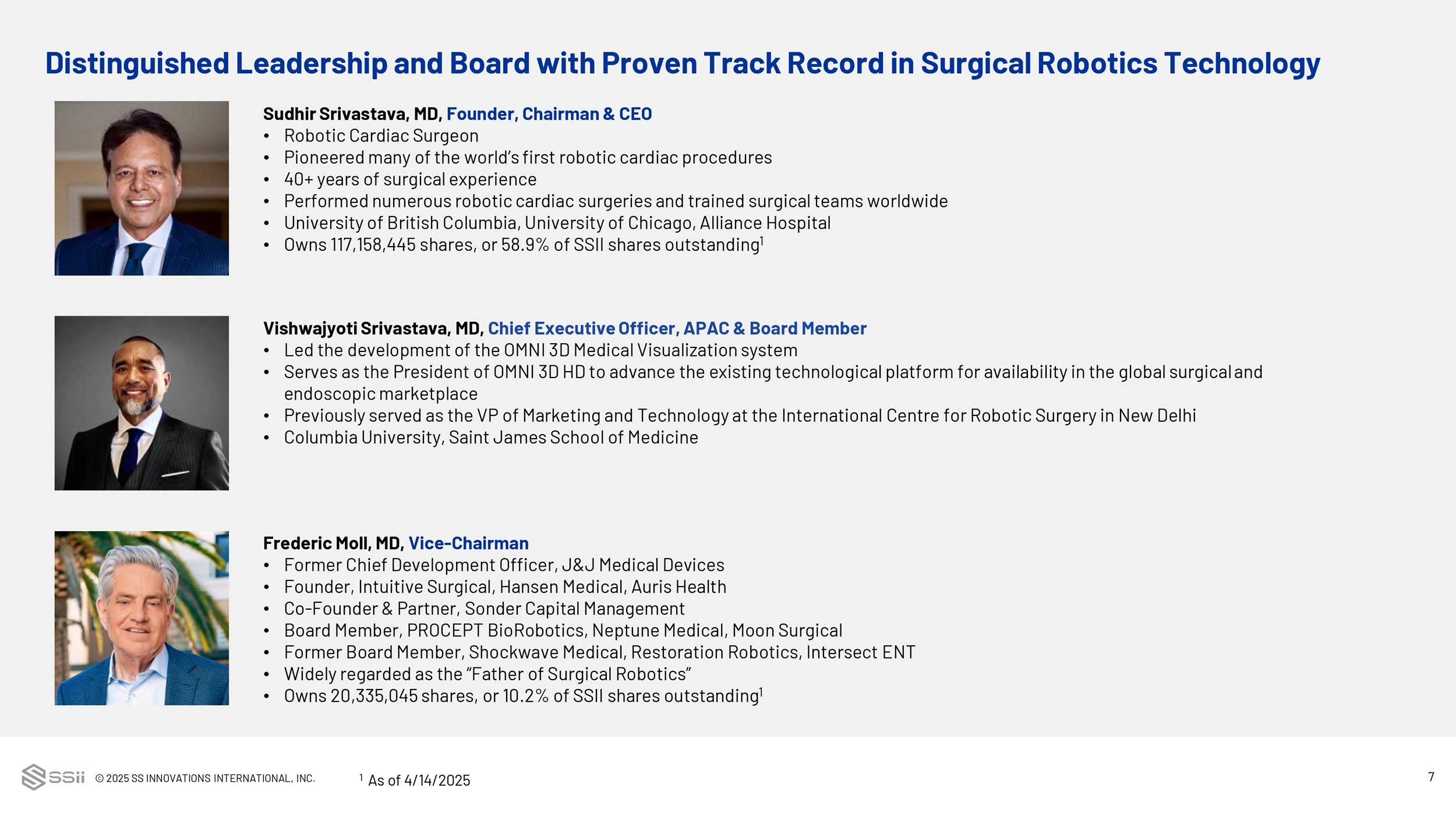 © 2025 SS INNOVATIONS INTERNATIONAL, INC. 6 • Distinguished Leadership and Board with Proven Track Record in Surgical Robotics Technology • Large and Growing Total Addressable Market with Favorable Industry Tailwinds • Advanced, Cost - Efficient Surgical Robotics Platform – Clinically and Commercially Differentiated • Established Presence in India with Global Expansion Underway • Strong Sales Growth with an Increasing Mix of Recurring Consumables Revenue and Expanding Margins • Strategy to Deliver Long - Term, Sustainable Growth 1 2 3 4 5 Investment Highlights 6