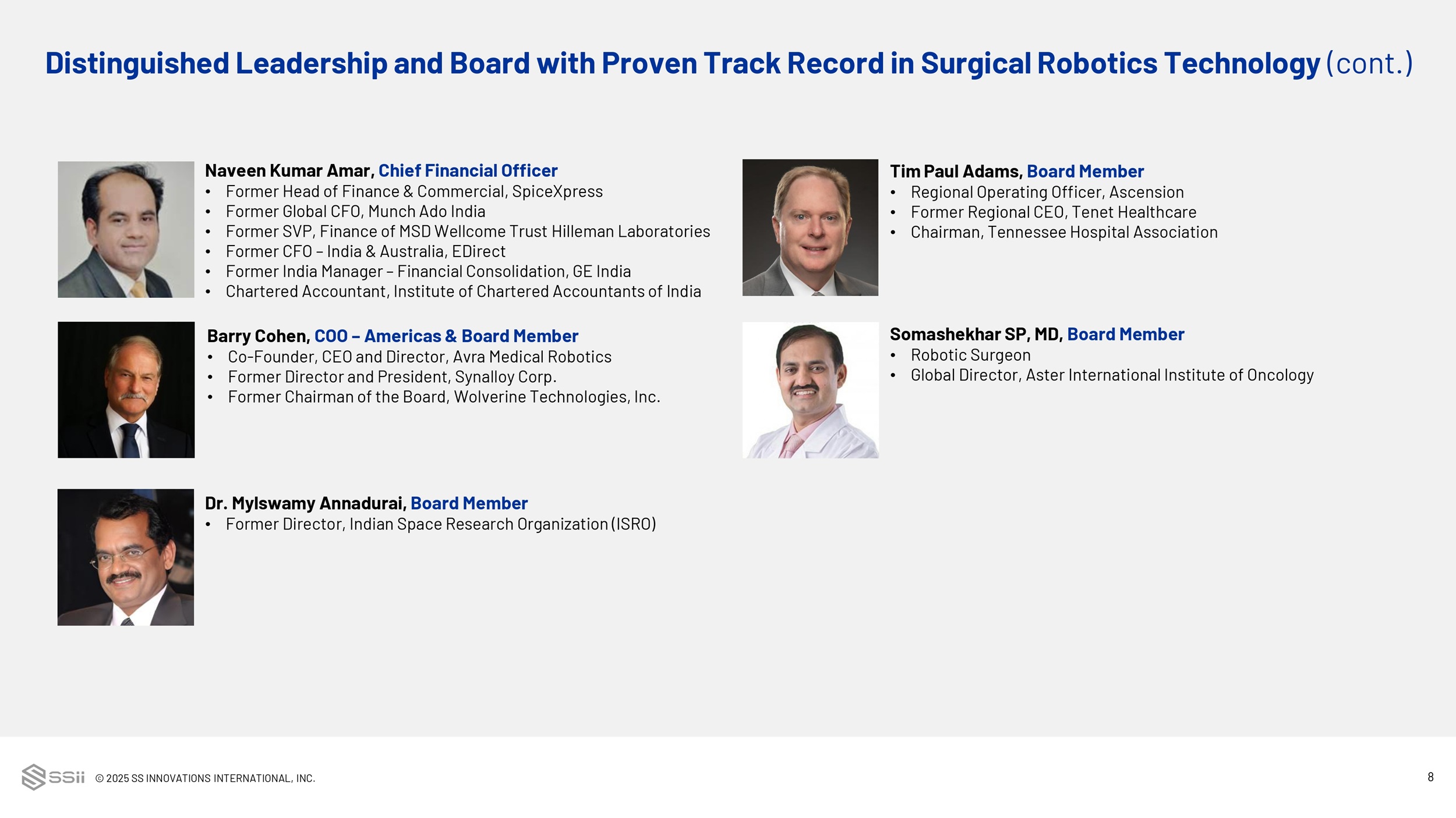 © 2025 SS INNOVATIONS INTERNATIONAL, INC. 7 Sudhir Srivastava, MD, Founder, Chairman & CEO • Robotic Cardiac Surgeon • Pioneered many of the world’s first robotic cardiac procedures • 40+ years of surgical experience • Performed numerous robotic cardiac surgeries and trained surgical teams worldwide • University of British Columbia, University of Chicago, Alliance Hospital • Owns 117,158,445 shares, or 58.9% of SSII shares outstanding 1 Frederic Moll, MD, Vice - Chairman • Former Chief Development Officer, J&J Medical Devices • Founder, Intuitive Surgical, Hansen Medical, Auris Health • Co - Founder & Partner, Sonder Capital Management • Board Member, PROCEPT BioRobotics, Neptune Medical, Moon Surgical • Former Board Member, Shockwave Medical, Restoration Robotics, Intersect ENT • Widely regarded as the “Father of Surgical Robotics” • Owns 20,335,045 shares, or 10.2% of SSII shares outstanding 1 Vishwajyoti Srivastava, MD, Chief Executive Officer, APAC & Board Member • Led the development of the OMNI 3D Medical Visualization system • Serves as the President of OMNI 3D HD to advance the existing technological platform for availability in the global surgical and endoscopic marketplace • Previously served as the VP of Marketing and Technology at the International Centre for Robotic Surgery in New Delhi • Columbia University, Saint James School of Medicine Distinguished Leadership and Board with Proven Track Record in Surgical Robotics Technology 1 As of 4/14/2025