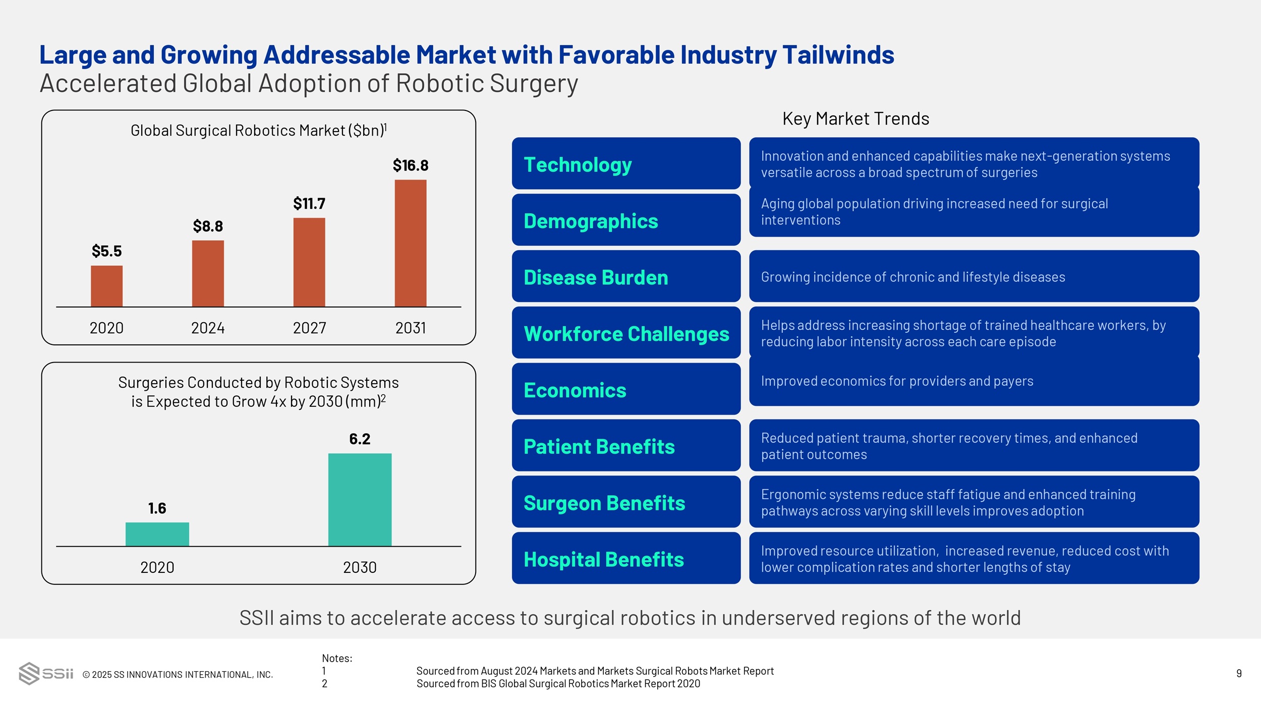 © 2025 SS INNOVATIONS INTERNATIONAL, INC. 10 Benefits of Robotic Surgery In the 20 Years Since Launch of Robotic Surgery, Access Remains Limited Installed base largely limited to the US, EU and Japan 7 billion people have access to only 5% of installed systems Less than 1% of surgical procedures worldwide each year are performed robotically 1 Key Challenges of Existing Systems High cost of acquisition and implementation Unattractive economics for hospitals with lower volumes Absence of trained personnel Lack of versatility and adaptability of systems and limited systems with multi - specialty capabilities Greater Precision Minimal Blood Loss Faster Recovery 10x Magnified 3D vision Less Pain and Discomfort Reduced Surgeon Fatigue Smaller Incisions on Patients Reduced Risk of Infection Note: 1 Estimate sourced from secondary market research Large and Growing Addressable Market with Favorable Industry Tailwinds Access to Robotic Surgery Remains Limited