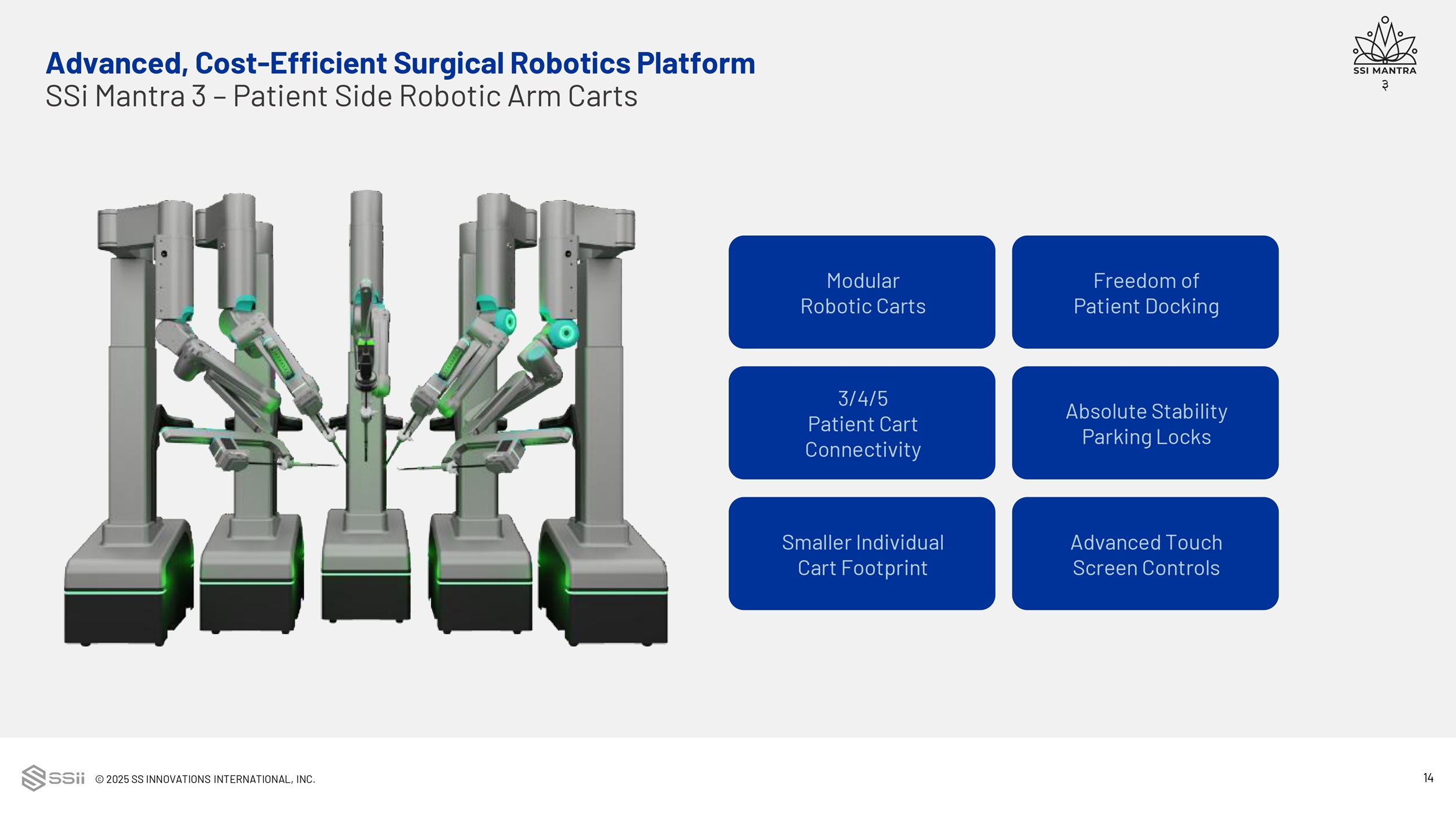 © 2025 SS INNOVATIONS INTERNATIONAL, INC. 12 Advanced, Cost - Efficient Surgical Robotics Platform SSi Mantra 3 1 2 3 1 Surgical Command Center Ergonomic open - faced console comprised of a pair of passive 3D glasses, a 3D 4k resolution monitor and a 2D touch monitor for system controls 2 Patient - Side Robotic Arm Carts Modular robotic arms mounted on individual carts with the option of using 3, 4 or 5 robotic arm configurations 3 Vision Cart 3D 4K resolution monitor, identical to the surgeon’s console, for OR staff. Also houses the control system for the articulating endoscope and camera and pre - operative guidance software 4 Instrument and Accessories Comprehensive suite of stapling, energy and core instrumentation for the surgical system under the brand name SSi Mudra 4