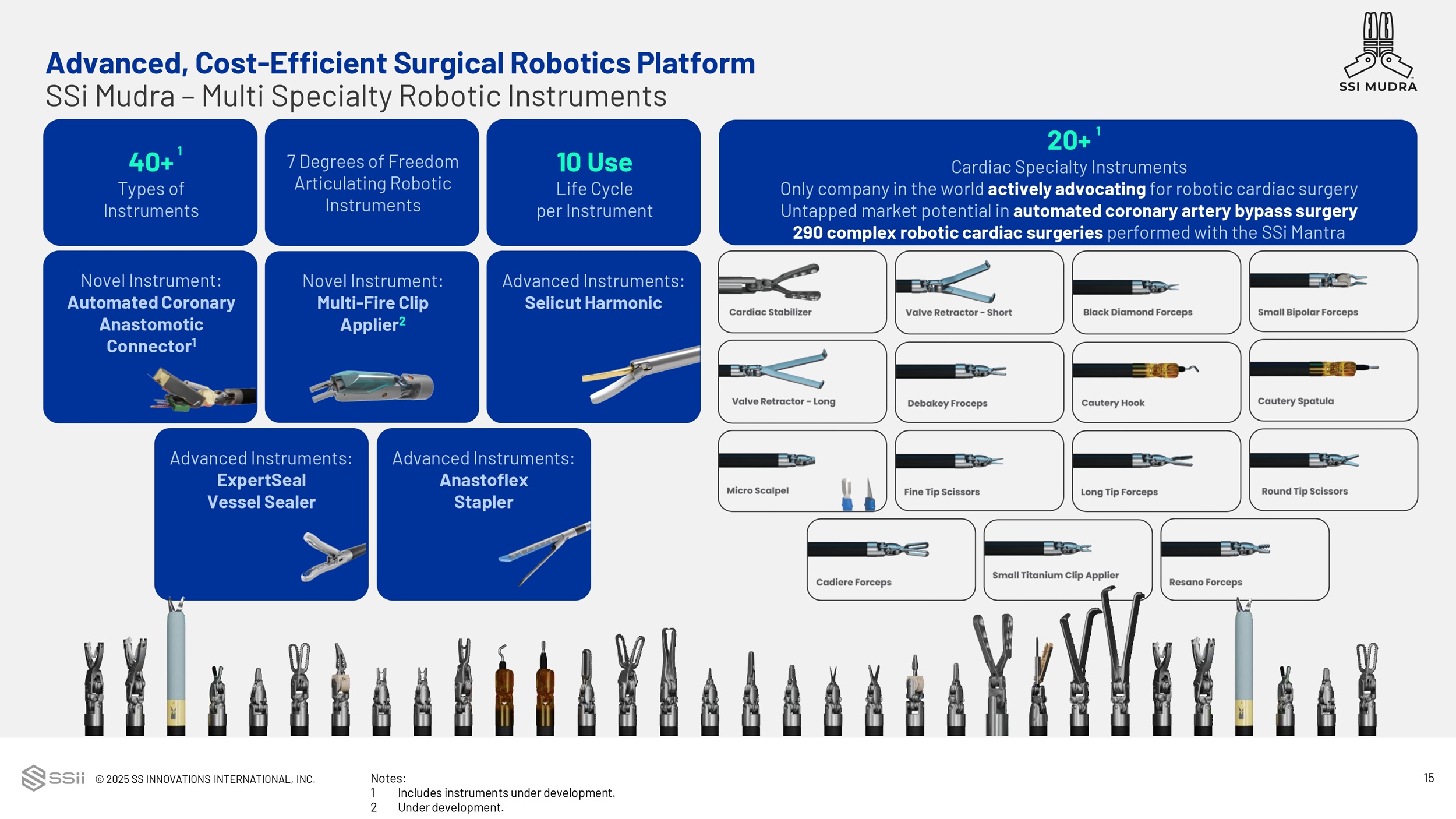 © 2025 SS INNOVATIONS INTERNATIONAL, INC. 19 Distalmotion Microport CMR Medtronic Intuitive SSII Benefit Feature Surgeon Command Center Yes No Yes Yes No Yes Ergonomic posture optimizes surgeon comfort and performance Open Face Console No Yes No No No Yes High resolution 3D video for accurate depth perception Large 3D 4K Monitor No Yes No Yes No Yes Large secondary visual interface to access system controls and data Large 2D Touch Controls Monitor No No No Yes No Yes Open console feature enables clear visibility of physical controls for better precision Hand and Foot Controls Visibility Yes No Yes Yes No Yes Better communication with support staff and patient access Instant Operating Room Visibility No No No No No Yes Completely free range of motions without mechanical restrictions Lightweight Magnetic, Ergonomic Controls No No Yes Yes No Yes Disables system controls when surgeon disengages hand controls Hand Controls Safety Patient Side Console Yes No Yes Yes No Yes Ease of multi - quadrant accessibility Modular Carts No No No No No Yes Enabling instrumentation for surgeon’s use in complex cases (cardiac) 5 Arm System No No No No No Yes Use of 3 - 5 arms based on surgical and cost requirements Robotic Arm Configuration Flexibility Vision Cart No No No No No Yes High resolution 3D video for accurate depth perception for surgical assistance Large 3D 4K Monitor for Staff No Yes No Yes No Yes Records intra - operative surgery videos for data analysis and training In - Built Recording System No No No No No Yes Reduces the need for multiple rigid endoscopes Articulating 3D Endoscope Instruments No No No No No Yes Instrument for beating heart totally endoscopic coronary artery bypass surgeries Cardiac Stabilizer No No No No No Yes Wristed and cost effective Articulating Reusable Vessel Sealer Enabling Technologies No Yes No No No Yes Enabling true remote access surgery to provide robotic surgery from experts Telesurgery No No No No No Yes Enabling mixed reality technologies to visualize patient data 3D XR DICOM Other No No No No No Yes Approximately 1/3rd the cost of competing systems Relative Cost Effectiveness No No No No Limited Yes Full range robotic cardiac surgery, including beating heart TECAB with SSI stabilizer Cardiac Surgery Capabilities Note: Please refer to the Instructions for Use for each robotic system for complete product information. Market landscape for in vestor purposes only. Advanced, Cost - Efficient Surgical Robotics Platform Robotics Market Landscape for Investors