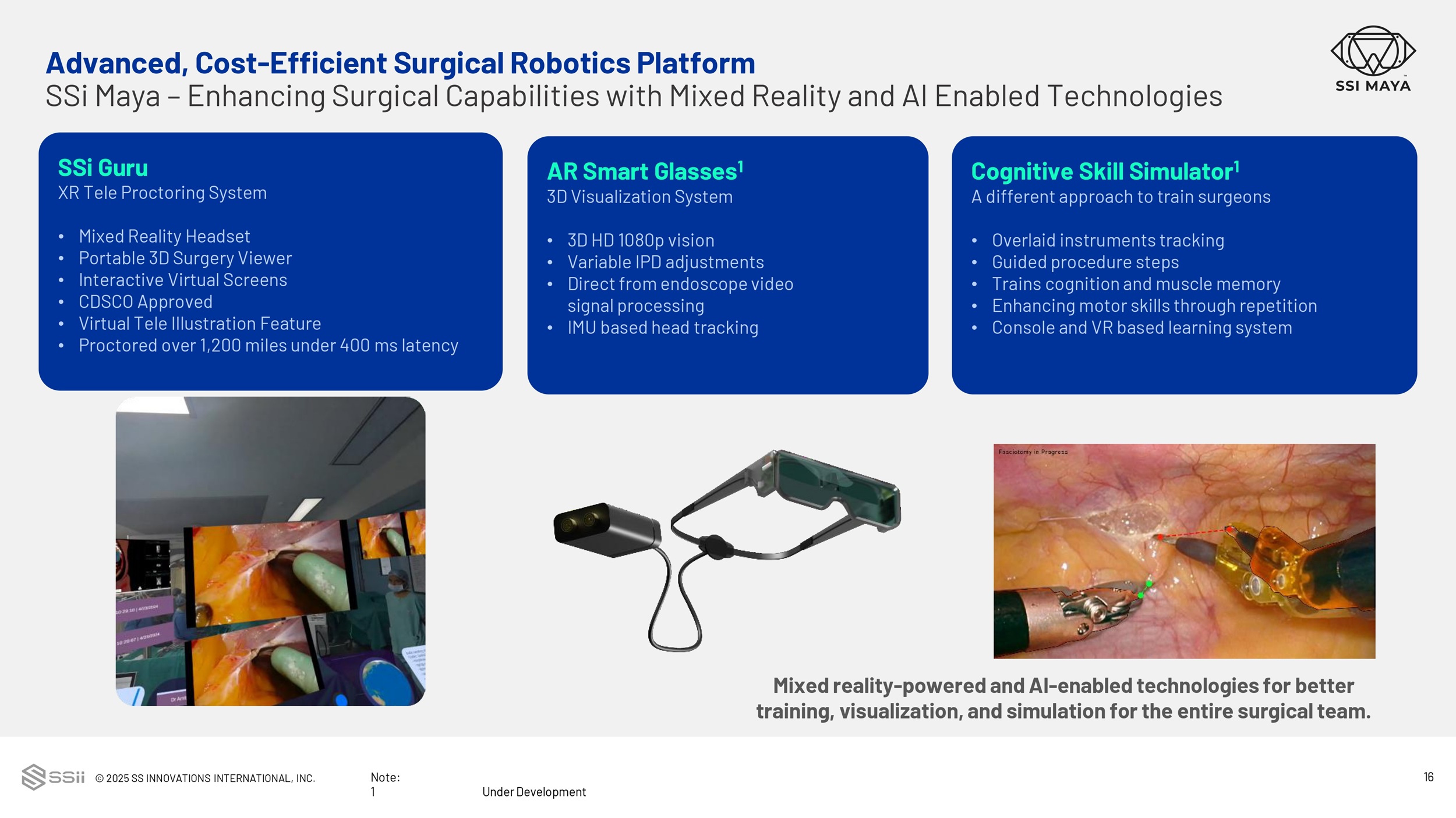 © 2025 SS INNOVATIONS INTERNATIONAL, INC. 15 Advanced, Cost - Efficient Surgical Robotics Platform SSi Mudra – Multi Specialty Robotic Instruments 7 Degrees of Freedom Articulating Robotic Instruments 10 Use Life Cycle per Instrument 20+ Cardiac Specialty Instruments Only company in the world actively advocating for robotic cardiac surgery Untapped market potential in automated coronary artery bypass surgery 290 complex robotic cardiac surgeries performed with the SSi Mantra 40+ Types of Instruments Novel Instrument: Automated Coronary Anastomotic Connector 1 Novel Instrument: Multi - Fire Clip Applier 2 Advanced Instruments: Selicut Harmonic Advanced Instruments: ExpertSeal Vessel Sealer Advanced Instruments: Anastoflex Stapler Notes: 1 Includes instruments under development. 2 Under development. 1 1