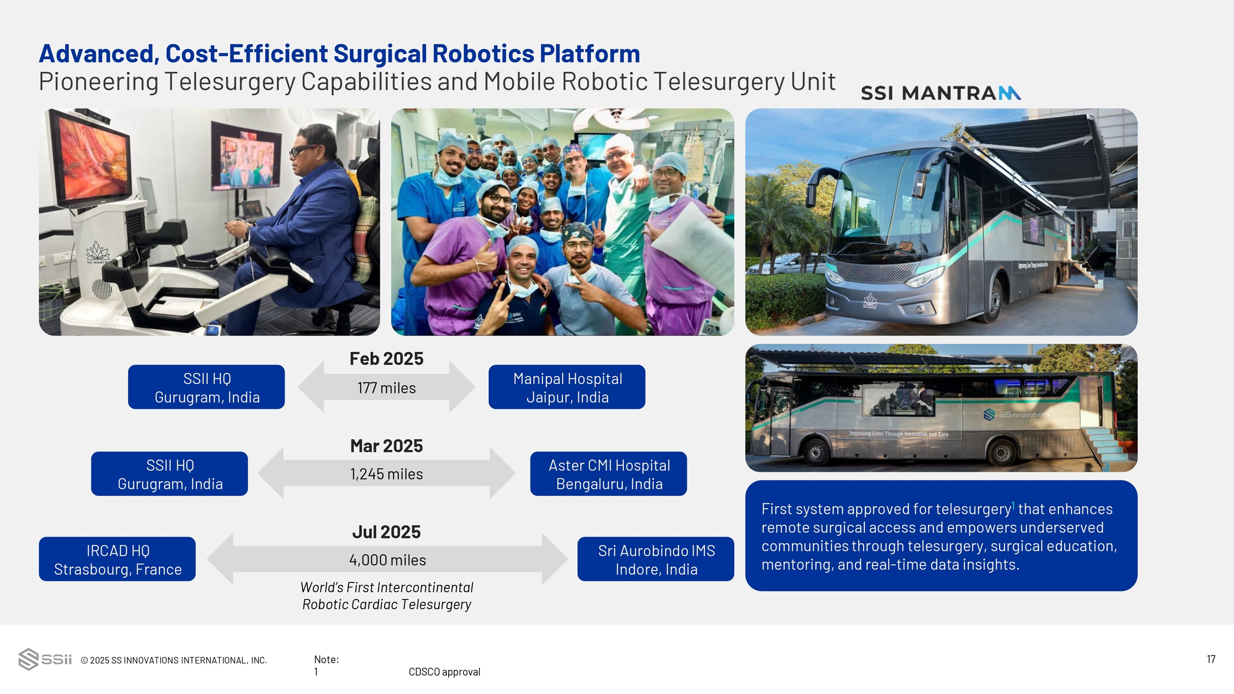 © 2025 SS INNOVATIONS INTERNATIONAL, INC. 16 Advanced, Cost - Efficient Surgical Robotics Platform SSi Maya – Enhancing Surgical Capabilities with Mixed Reality and AI Enabled Technologies SSi Guru XR Tele Proctoring System • Mixed Reality Headset • Portable 3D Surgery Viewer • Interactive Virtual Screens • CDSCO Approved • Virtual Tele Illustration Feature • Proctored over 1,200 miles under 400 ms latency AR Smart Glasses 1 3D Visualization System • 3D HD 1080p vision • Variable IPD adjustments • Direct from endoscope video signal processing • IMU based head tracking Cognitive Skill Simulator 1 A different approach to train surgeons • Overlaid instruments tracking • Guided procedure steps • Trains cognition and muscle memory • Enhancing motor skills through repetition • Console and VR based learning system Mixed reality - powered and AI - enabled technologies for better training, visualization, and simulation for the entire surgical team. Note: 1 Under Development