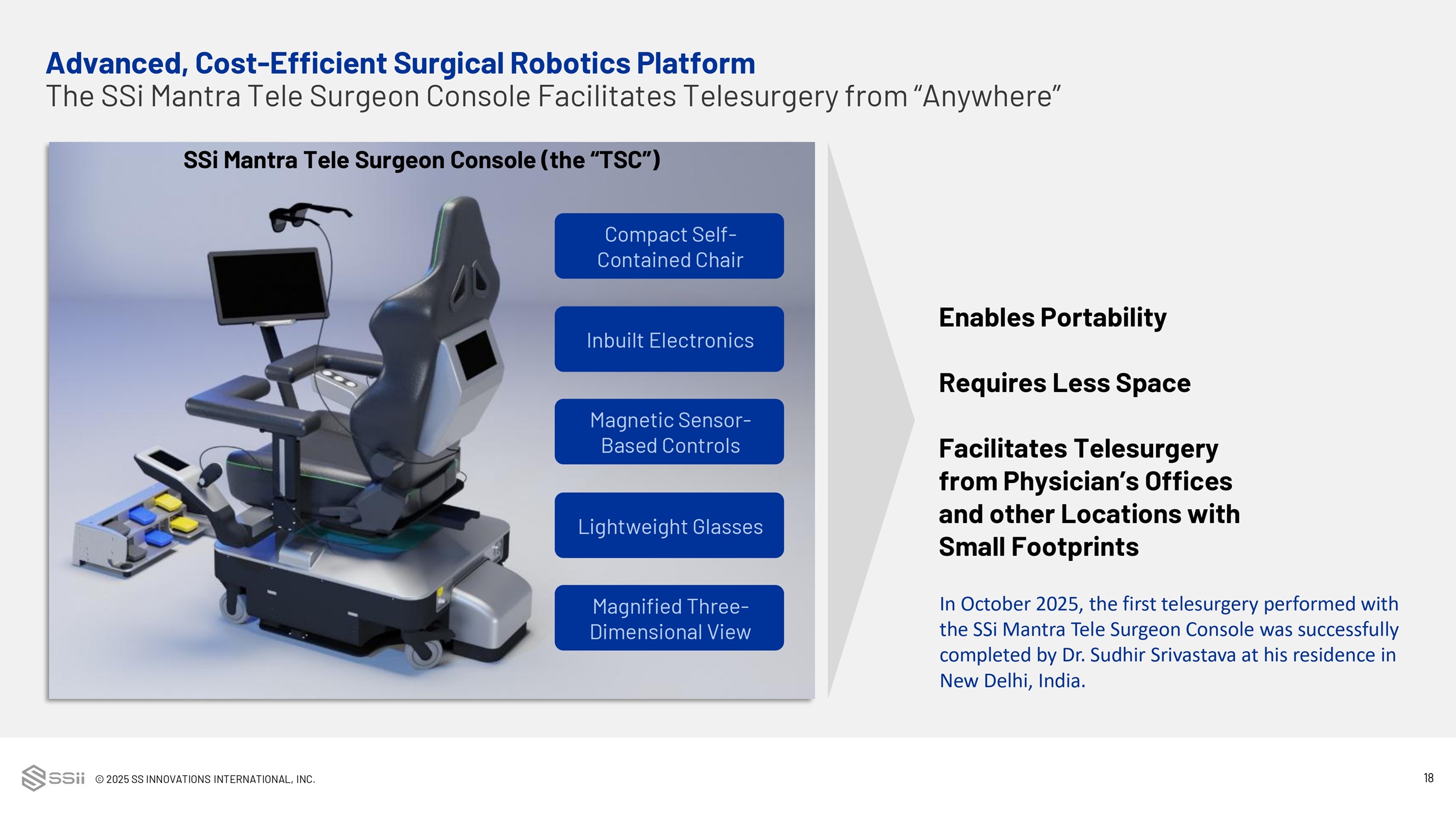 © 2025 SS INNOVATIONS INTERNATIONAL, INC. 17 Advanced, Cost - Efficient Surgical Robotics Platform Pioneering Telesurgery Capabilities and Mobile Robotic Telesurgery Unit First system approved for telesurgery 1 that enhances remote surgical access and empowers underserved communities through telesurgery, surgical education, mentoring, and real - time data insights. Note: 1 CDSCO approval SSII HQ Gurugram, India Manipal Hospital Jaipur, India 177 miles Feb 2025 SSII HQ Gurugram, India Aster CMI Hospital Bengaluru, India 1,245 miles Mar 2025 IRCAD HQ Strasbourg, France Sri Aurobindo IMS Indore, India 4,000 miles Jul 2025 World’s First Intercontinental Robotic Cardiac Telesurgery