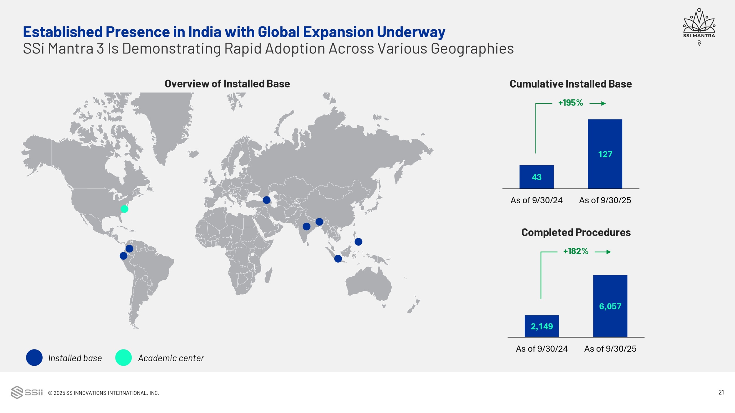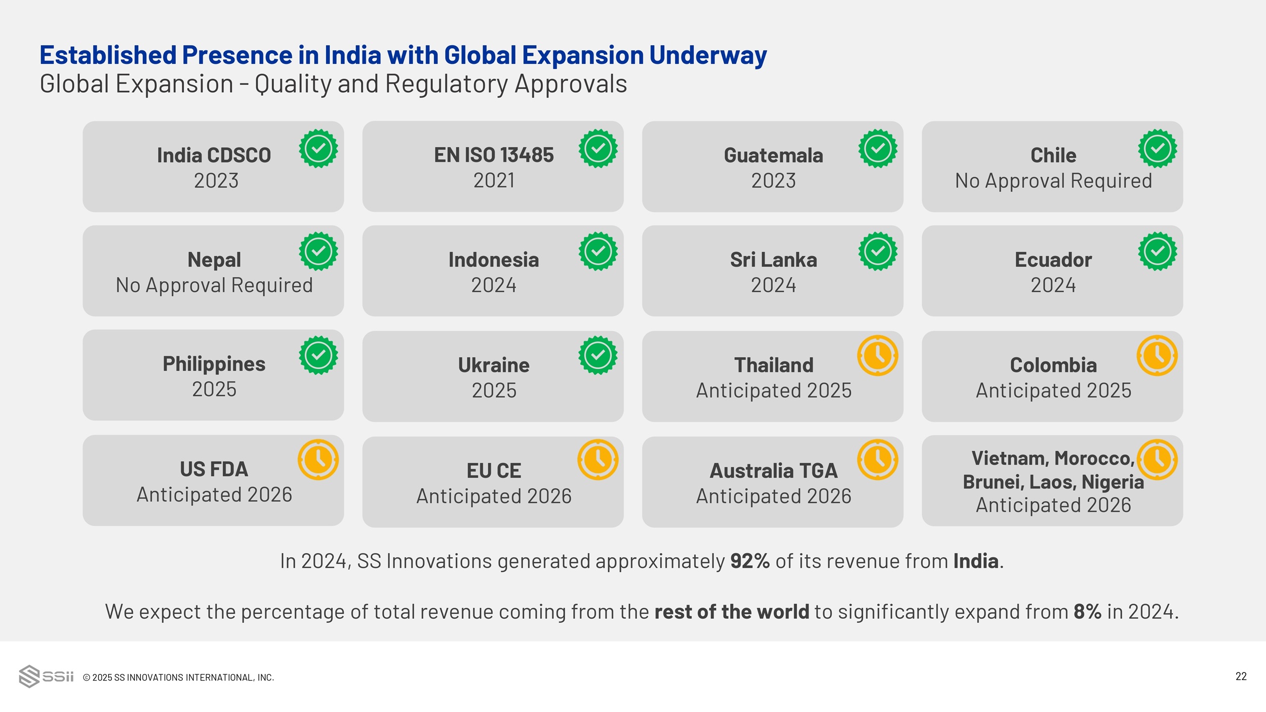 © 2025 SS INNOVATIONS INTERNATIONAL, INC. 21 43 127 As of 9/30/24 As of 9/30/25 Cumulative Installed Base 2,149 6,057 As of 9/30/24 As of 9/30/25 Completed Procedures Installed base Overview of Installed Base +195% +182% Academic center Established Presence in India with Global Expansion Underway SSi Mantra 3 Is Demonstrating Rapid Adoption Across Various Geographies