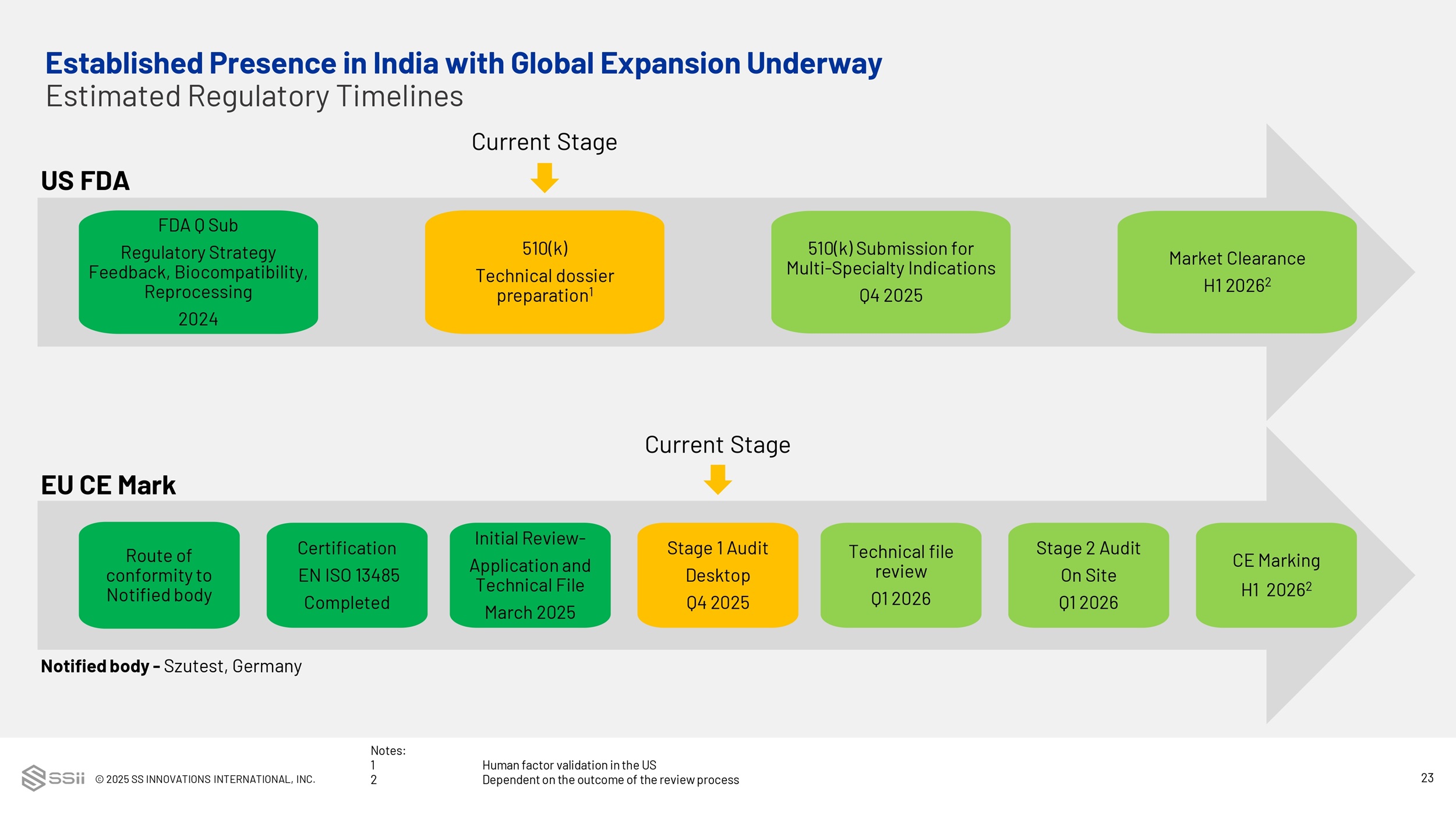 © 2025 SS INNOVATIONS INTERNATIONAL, INC. 23 Route of conformity to Notified body Certification EN ISO 13485 Completed Stage 1 Audit Desktop Q4 2025 Stage 2 Audit On Site Q1 2026 CE Marking H1 2026 2 Initial Review - Application and Technical File March 2025 Notified body - Szutest , Germany Current Stage Technical file review Q1 2026 EU CE Mark Notes: 1 Human factor validation in the US 2 Dependent on the outcome of the review process Established Presence in India with Global Expansion Underway Estimated Regulatory Timelines FDA Q Sub Regulatory Strategy Feedback, Biocompatibility, Reprocessing 2024 510(k) Technical dossier preparation 1 510(k) Submission for Multi - Specialty Indications Q4 2025 Market Clearance H1 2026 2 Current Stage US FDA