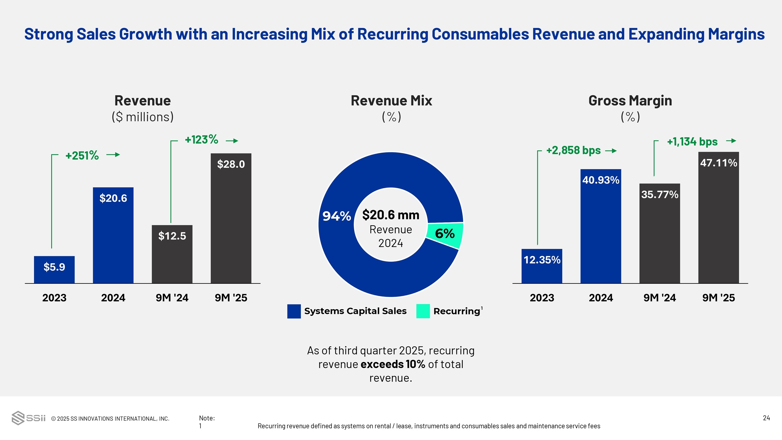 © 2025 SS INNOVATIONS INTERNATIONAL, INC. 24 94% 6% $20.6 mm Revenue 2024 Strong Sales Growth with an Increasing Mix of Recurring Consumables Revenue and Expanding Margins $ 5.9 $ 20.6 $12.5 $28.0 2023 2024 9M '24 9M '25 Revenue ($ millions) Note: 1 Recurring revenue defined as systems on rental / lease, instruments and consumables sales and maintenance service fees + 251 % + 123 % Gross Margin (%) 12.35% 40.93% 35.77% 47.11% 2023 2024 9M '24 9M '25 +2,858 bps +1,134 bps Revenue Mix (%) Systems Capital Sales Recurring As of third quarter 2025, recurring revenue exceeds 10% of total revenue. 1