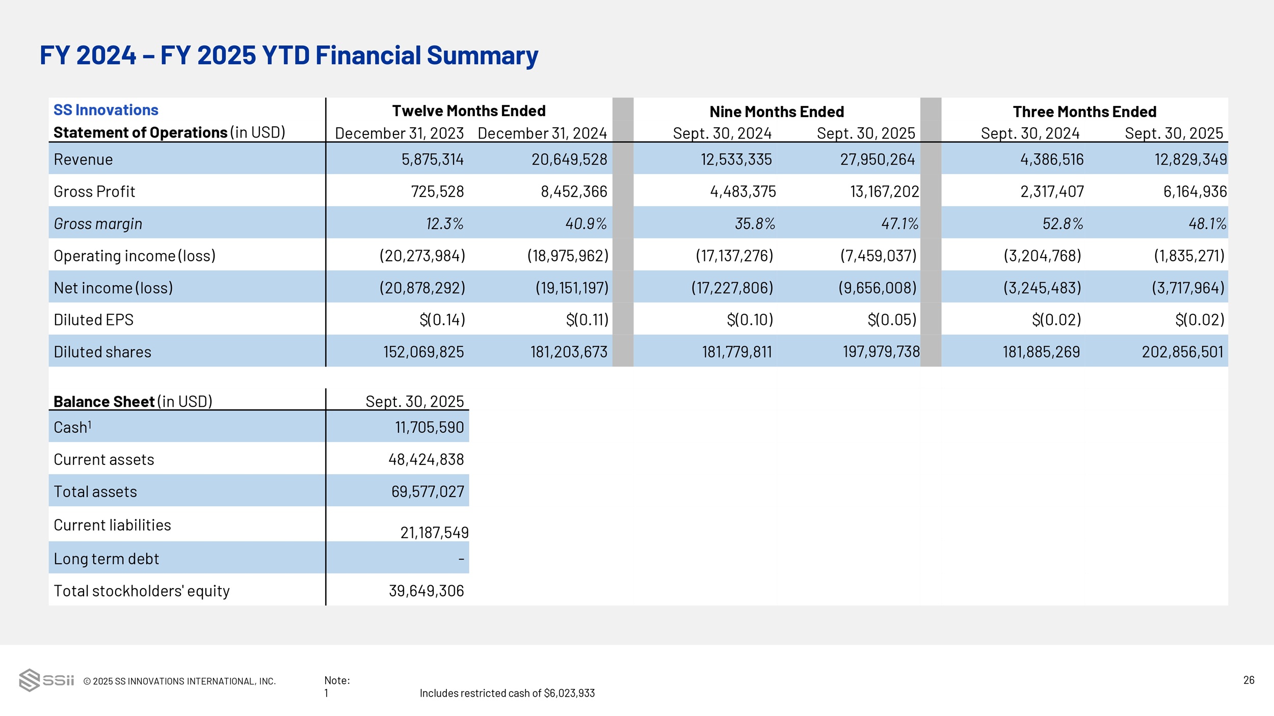 © 2025 SS INNOVATIONS INTERNATIONAL, INC. 26 FY 2024 – FY 2025 YTD Financial Summary Three Months Ended Nine Months Ended Twelve Months Ended SS Innovations Sept. 30, 2025 Sept. 30 , 2024 Sept. 30, 2025 Sept. 30 , 2024 December 31, 2024 December 31, 2023 Statement of Operations (in USD) 12,829,349 4,386,516 27,950,264 12,533,335 20,649,528 5,875,314 Revenue 6,164,936 2,317,407 13,167,202 4,483,375 8,452,366 725,528 Gross Profit 48.1% 52.8% 47.1% 35.8% 40.9% 12.3% Gross margin (1,835,271) (3,204,768) (7,459,037) (17,137,276) (18,975,962) (20,273,984) Operating income (loss) (3,717,964) (3,245,483) (9,656,008) (17,227,806) (19,151,197) (20,878,292) Net income (loss) $(0.02) $(0.02) $(0.05) $(0.10) $(0.11) $(0.14) Diluted EPS 202,856,501 181,885,269 197,979,738 181,779,811 181,203,673 152,069,825 Diluted shares Sept. 30, 2025 Balance Sheet (in USD) 11,705,590 Cash 1 48,424,838 Current assets 69,577,027 Total assets 21,187,549 Current liabilities - Long term debt 39,649,306 Total stockholders' equity Note: 1 Includes restricted cash of $6,023,933