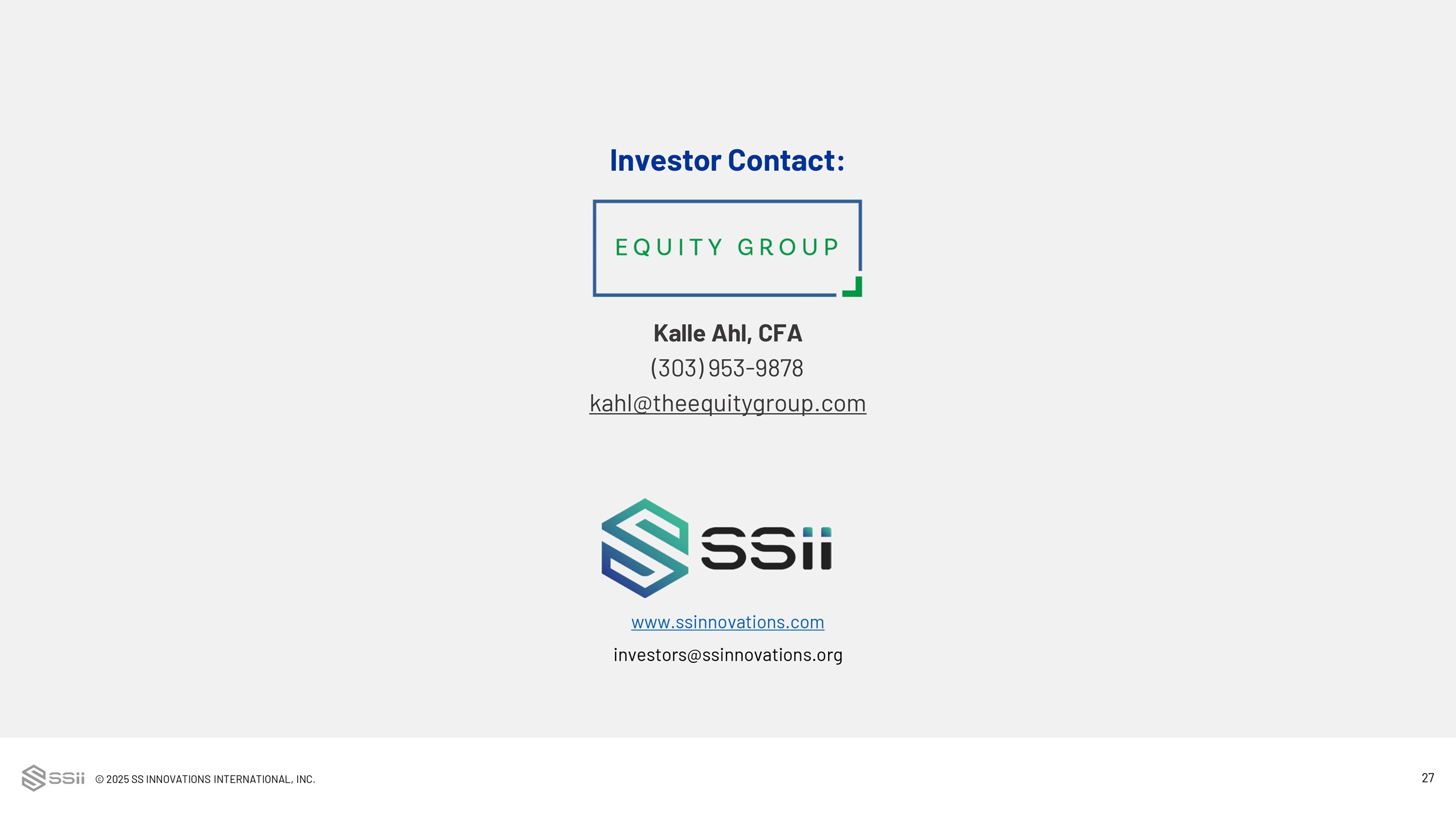 © 2025 SS INNOVATIONS INTERNATIONAL, INC. 27 www.ssinnovations.com investors@ssinnovations.org Investor Contact: Kalle Ahl, CFA (303) 953 - 9878 kahl@theequitygroup.com
