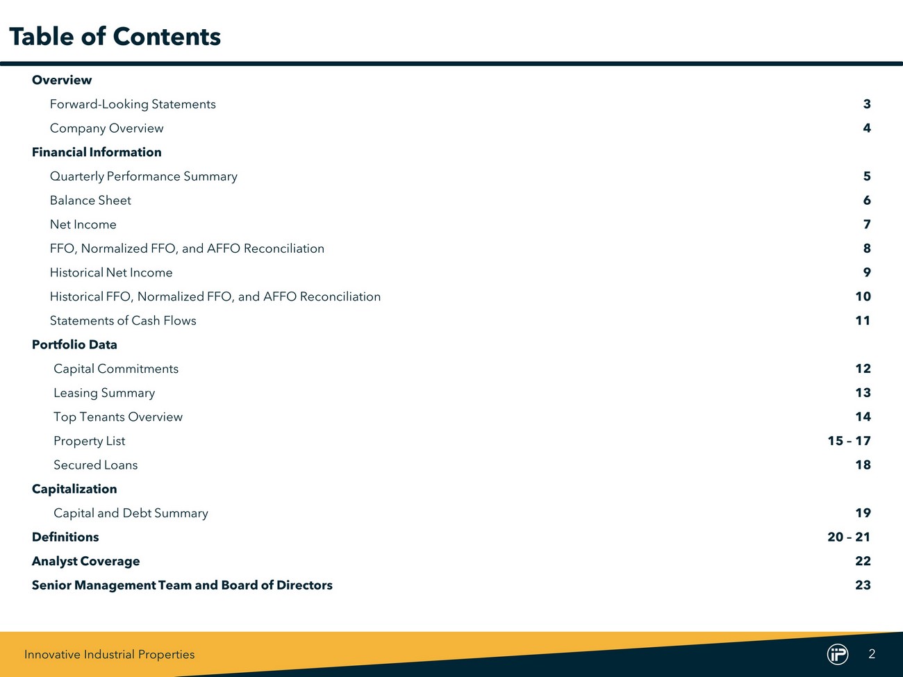 Innovative Industrial Properties 2 Overview Forward - Looking Statements 3 Company Overview 4 Financial Information Quarterly Performance Summary 5 Balance Sheet 6 Net Income 7 FFO, Normalized FFO, and AFFO Reconciliation 8 Historical Net Income 9 Historical FFO, Normalized FFO, and AFFO Reconciliation 10 Statements of Cash Flows 11 Portfolio Data Capital Commitments 12 Leasing Summary 13 Top Tenants Overview 14 Property List 15 – 17 Secured Loans 18 Capitalization Capital and Debt Summary 19 Definitions 20 – 21 Analyst Coverage 22 Senior Management Team and Board of Directors 23 Table of Contents