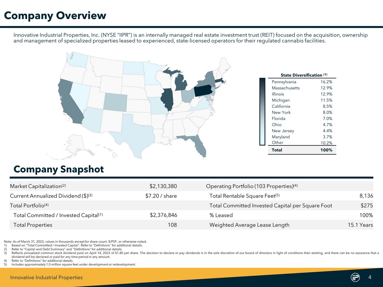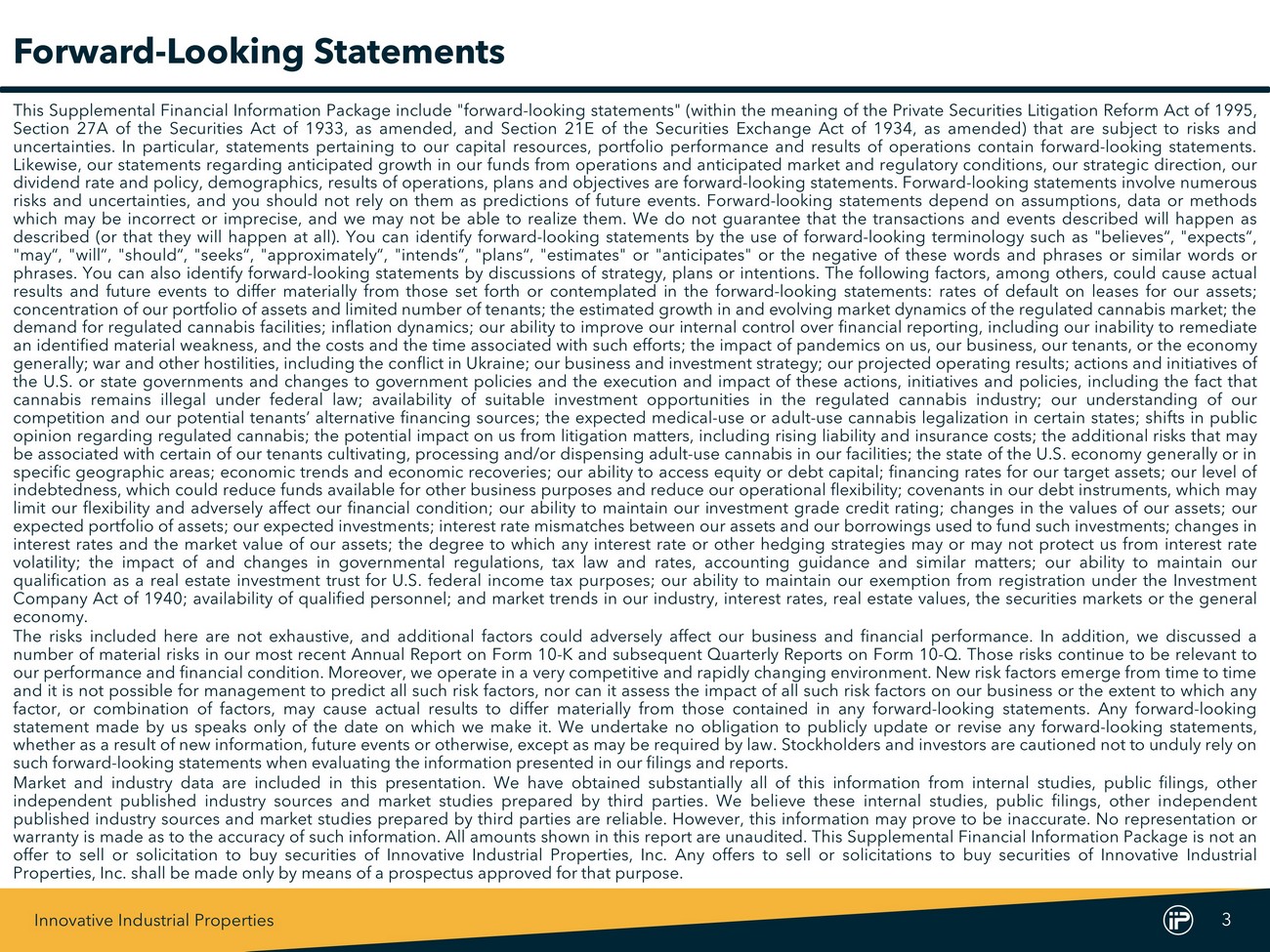Innovative Industrial Properties 3 Forward - Looking Statements This Supplemental Financial Information Package include "forward - looking statements" (within the meaning of the Private Securities Litigation Reform Act of 1995 , Section 27 A of the Securities Act of 1933 , as amended, and Section 21 E of the Securities Exchange Act of 1934 , as amended) that are subject to risks and uncertainties . In particular, statements pertaining to our capital resources, portfolio performance and results of operations contain forward - looking statements . Likewise, our statements regarding anticipated growth in our funds from operations and anticipated market and regulatory conditions, our strategic direction, our dividend rate and policy, demographics, results of operations, plans and objectives are forward - looking statements . Forward - looking statements involve numerous risks and uncertainties, and you should not rely on them as predictions of future events . Forward - looking statements depend on assumptions, data or methods which may be incorrect or imprecise, and we may not be able to realize them . We do not guarantee that the transactions and events described will happen as described (or that they will happen at all) . You can identify forward - looking statements by the use of forward - looking terminology such as "believes“, "expects“, "may“, "will“, "should“, "seeks“, "approximately“, "intends“, "plans“, "estimates" or "anticipates" or the negative of these words and phrases or similar words or phrases . You can also identify forward - looking statements by discussions of strategy, plans or intentions . The following factors, among others, could cause actual results and future events to differ materially from those set forth or contemplated in the forward - looking statements : rates of default on leases for our assets ; concentration of our portfolio of assets and limited number of tenants ; the estimated growth in and evolving market dynamics of the regulated cannabis market ; the demand for regulated cannabis facilities ; inflation dynamics ; our ability to improve our internal control over financial reporting, including our inability to remediate an identified material weakness, and the costs and the time associated with such efforts ; the impact of pandemics on us, our business, our tenants, or the economy generally ; war and other hostilities, including the conflict in Ukraine ; our business and investment strategy ; our projected operating results ; actions and initiatives of the U . S . or state governments and changes to government policies and the execution and impact of these actions, initiatives and policies, including the fact that cannabis remains illegal under federal law ; availability of suitable investment opportunities in the regulated cannabis industry ; our understanding of our competition and our potential tenants’ alternative financing sources ; the expected medical - use or adult - use cannabis legalization in certain states ; shifts in public opinion regarding regulated cannabis ; the potential impact on us from litigation matters, including rising liability and insurance costs ; the additional risks that may be associated with certain of our tenants cultivating, processing and/or dispensing adult - use cannabis in our facilities ; the state of the U . S . economy generally or in specific geographic areas ; economic trends and economic recoveries ; our ability to access equity or debt capital ; financing rates for our target assets ; our level of indebtedness, which could reduce funds available for other business purposes and reduce our operational flexibility ; covenants in our debt instruments, which may limit our flexibility and adversely affect our financial condition ; our ability to maintain our investment grade credit rating ; changes in the values of our assets ; our expected portfolio of assets ; our expected investments ; interest rate mismatches between our assets and our borrowings used to fund such investments ; changes in interest rates and the market value of our assets ; the degree to which any interest rate or other hedging strategies may or may not protect us from interest rate volatility ; the impact of and changes in governmental regulations, tax law and rates, accounting guidance and similar matters ; our ability to maintain our qualification as a real estate investment trust for U . S . federal income tax purposes ; our ability to maintain our exemption from registration under the Investment Company Act of 1940 ; availability of qualified personnel ; and market trends in our industry, interest rates, real estate values, the securities markets or the general economy . The risks included here are not exhaustive, and additional factors could adversely affect our business and financial performance . In addition, we discussed a number of material risks in our most recent Annual Report on Form 10 - K and subsequent Quarterly Reports on Form 10 - Q . Those risks continue to be relevant to our performance and financial condition . Moreover, we operate in a very competitive and rapidly changing environment . New risk factors emerge from time to time and it is not possible for management to predict all such risk factors, nor can it assess the impact of all such risk factors on our business or the extent to which any factor, or combination of factors, may cause actual results to differ materially from those contained in any forward - looking statements . Any forward - looking statement made by us speaks only of the date on which we make it . We undertake no obligation to publicly update or revise any forward - looking statements, whether as a result of new information, future events or otherwise, except as may be required by law . Stockholders and investors are cautioned not to unduly rely on such forward - looking statements when evaluating the information presented in our filings and reports . Market and industry data are incl