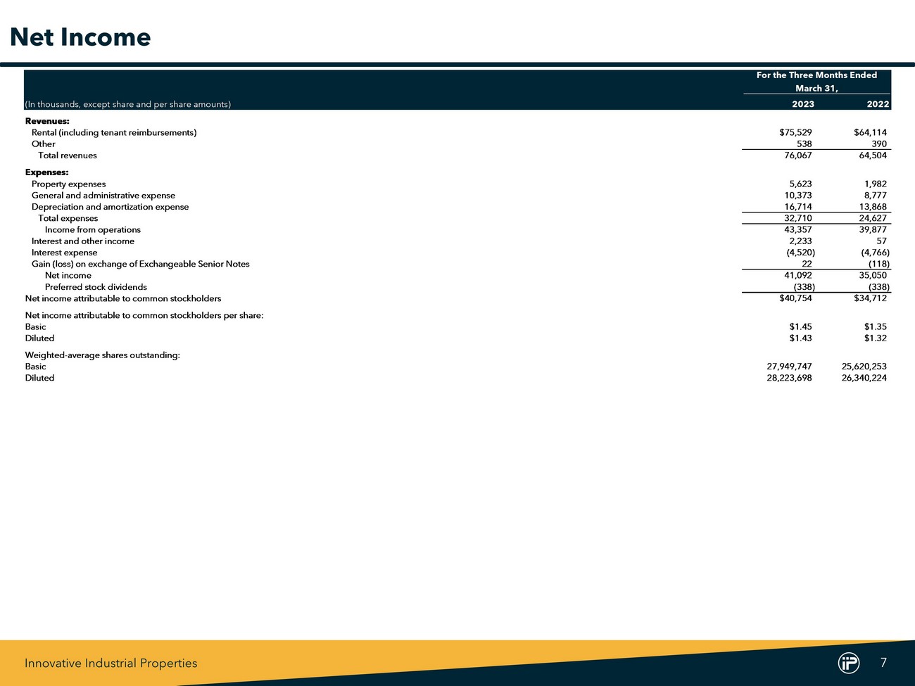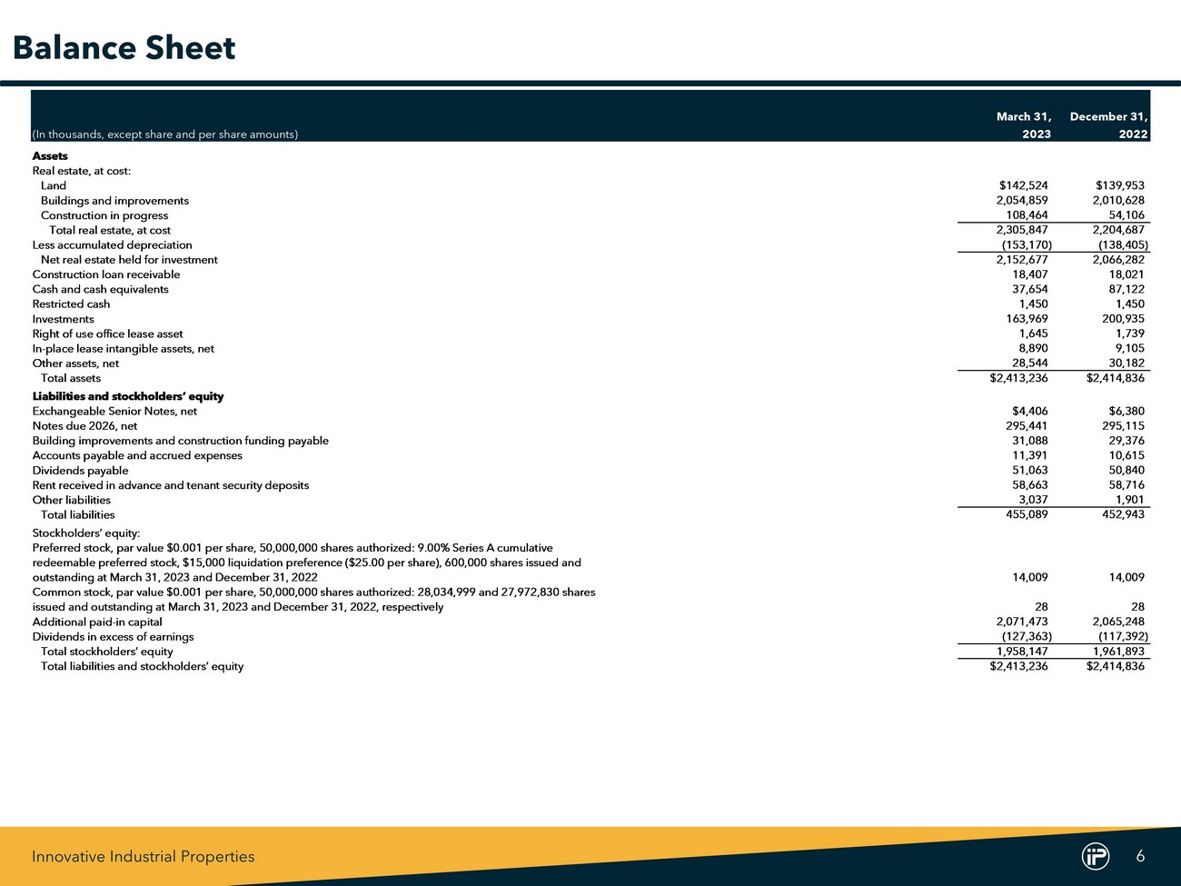 Innovative Industrial Properties 6 March 31, December 31, (In thousands, except share and per share amounts) 2023 2022 Assets Real estate, at cost: Land $142,524 $139,953 Buildings and improvements 2,054,859 2,010,628 Construction in progress 108,464 54,106 Total real estate, at cost 2,305,847 2,204,687 Less accumulated depreciation (153,170) (138,405) Net real estate held for investment 2,152,677 2,066,282 Construction loan receivable 18,407 18,021 Cash and cash equivalents 37,654 87,122 Restricted cash 1,450 1,450 Investments 163,969 200,935 Right of use office lease asset 1,645 1,739 In-place lease intangible assets, net 8,890 9,105 Other assets, net 28,544 30,182 Total assets $2,413,236 $2,414,836 Liabilities and stockholders’ equity Exchangeable Senior Notes, net $4,406 $6,380 Notes due 2026, net 295,441 295,115 Building improvements and construction funding payable 31,088 29,376 Accounts payable and accrued expenses 11,391 10,615 Dividends payable 51,063 50,840 Rent received in advance and tenant security deposits 58,663 58,716 Other liabilities 3,037 1,901 Total liabilities 455,089 452,943 Stockholders’ equity: Preferred stock, par value $0.001 per share, 50,000,000 shares authorized: 9.00% Series A cumulative redeemable preferred stock, $15,000 liquidation preference ($25.00 per share), 600,000 shares issued and outstanding at March 31, 2023 and December 31, 2022 14,009 14,009 Common stock, par value $0.001 per share, 50,000,000 shares authorized: 28,034,999 and 27,972,830 shares issued and outstanding at March 31, 2023 and December 31, 2022, respectively 28 28 Additional paid-in capital 2,071,473 2,065,248 Dividends in excess of earnings (127,363) (117,392) Total stockholders’ equity 1,958,147 1,961,893 Total liabilities and stockholders ’ equity $2,413,236 $2,414,836 Balance Sheet