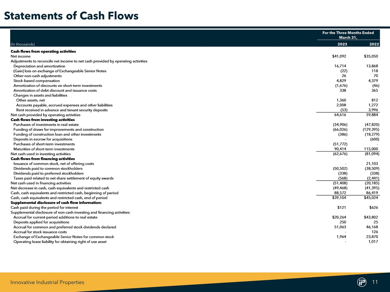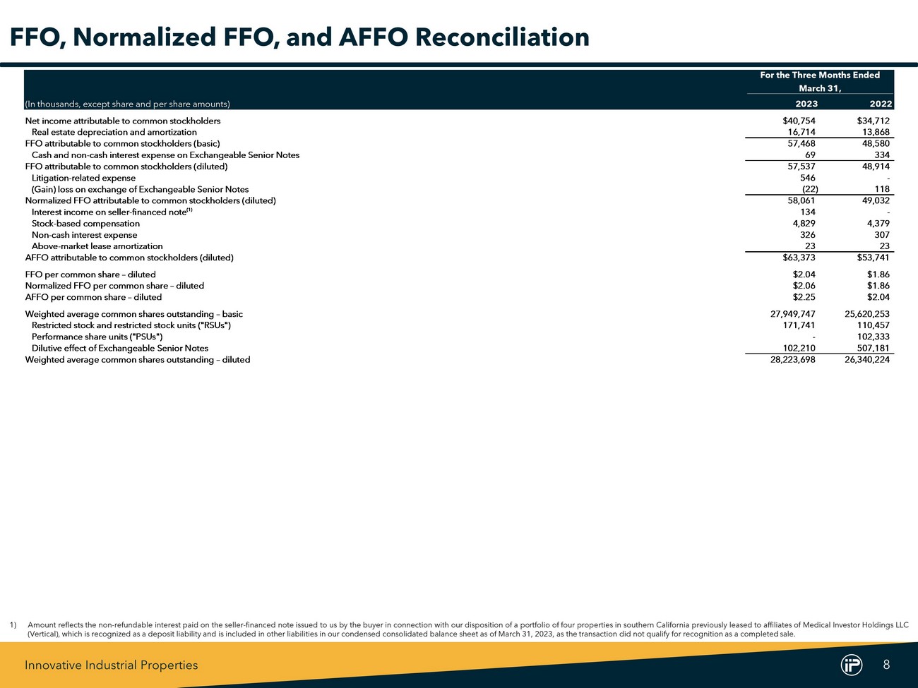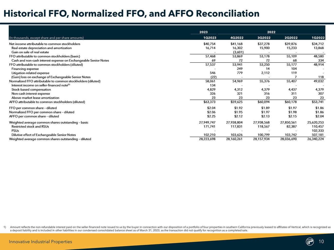 Innovative Industrial Properties 10 2023 2022 (In thousands, except share and per share amounts) 1Q2023 4Q2022 3Q2022 2Q2022 1Q2022 Net income attributable to common stockholders $40,754 $41,168 $37,278 $39,876 $34,712 Real estate depreciation and amortization 16,714 16,302 15,900 15,233 13,868 Gain on sale of real estate - (3,601) - - - FFO attributable to common stockholders (basic) 57,468 53,869 53,178 55,109 48,580 Cash and non-cash interest expense on Exchangeable Senior Notes 69 72 72 68 334 FFO attributable to common stockholders (diluted) 57,537 53,941 53,250 55,177 48,914 Financing expense - 249 14 104 - Litigation-related expense 546 779 2,112 119 - (Gain) loss on exchange of Exchangeable Senior Notes (22) - - 7 118 Normalized FFO attributable to common stockholders (diluted) 58,061 54,969 55,376 55,407 49,032 Interest income on seller-financed note (1) 134 - - - - Stock-based compensation 4,829 4,312 4,379 4,437 4,379 Non-cash interest expense 326 321 316 311 307 Above-market lease amortization 23 23 23 23 23 AFFO attributable to common stockholders (diluted) $63,373 $59,625 $60,094 $60,178 $53,741 FFO per common share – diluted $2.04 $1.92 $1.89 $1.97 $1.86 Normalized FFO per common share – diluted $2.06 $1.95 $1.97 $1.98 $1.86 AFFO per common share – diluted $2.25 $2.12 $2.13 $2.15 $2.04 Weighted average common shares outstanding – basic 27,949,747 27,938,804 27,938,568 27,850,561 25,620,253 Restricted stock and RSUs 171,741 117,831 118,567 82,387 110,457 PSUs - - - - 102,333 Dilutive effect of Exchangeable Senior Notes 102,210 103,626 100,799 103,742 507,181 Weighted average common shares outstanding – diluted 28,223,698 28,160,261 28,157,934 28,036,690 26,340,224 Historical FFO, Normalized FFO, and AFFO Reconciliation 1) Amount reflects the non - refundable interest paid on the seller - financed note issued to us by the buyer in connection with our disposition of a portfolio of four properties in southern California previously leased to affiliates of Vertical, which is recognized as a deposit liability and is included in other liabilities in our condensed consolidated balance sheet as of March 31 , 2023 , as the transaction did not qualify for recognition as a completed sale .