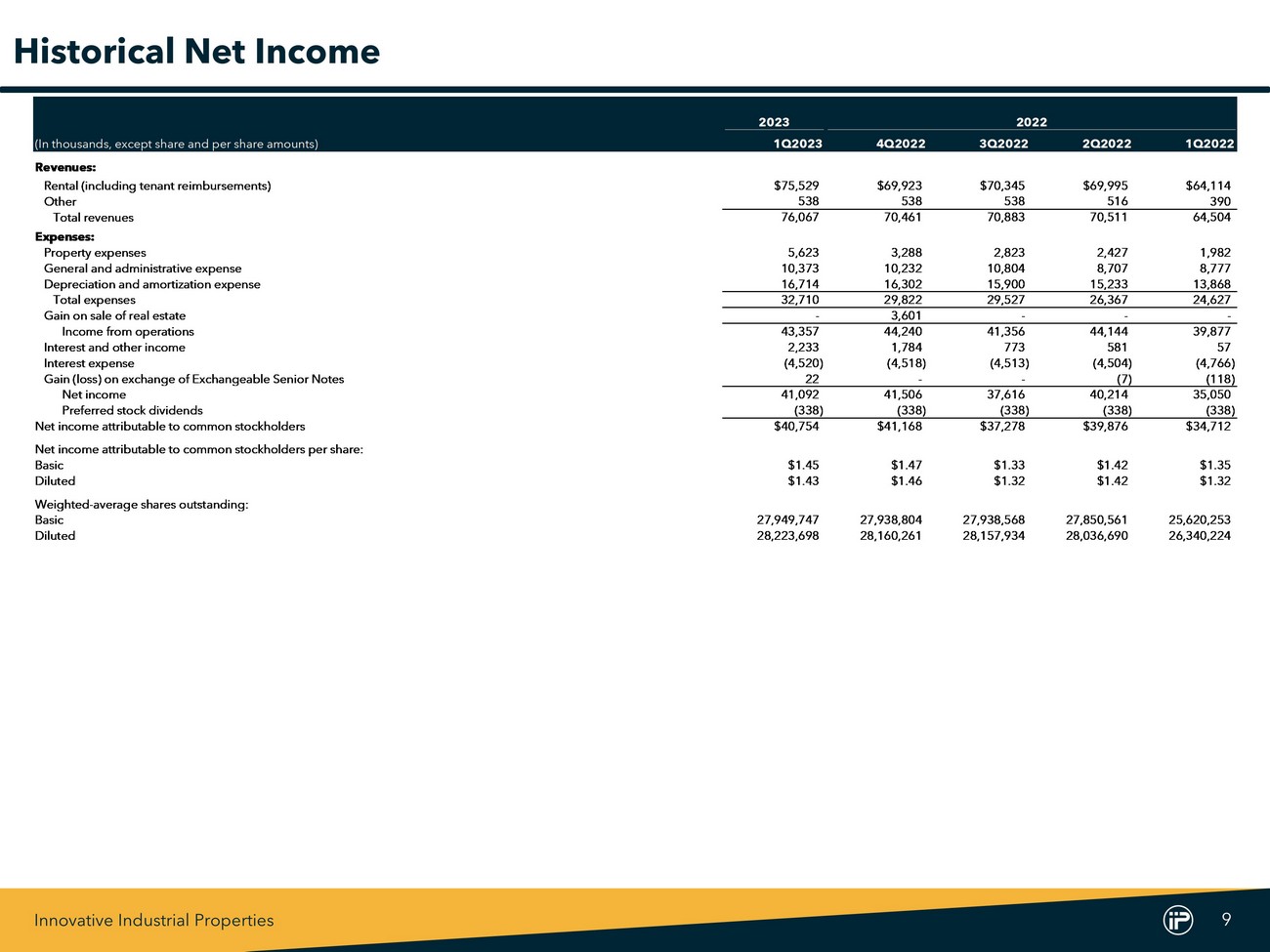 Innovative Industrial Properties 9 2023 2022 (In thousands, except share and per share amounts) 1Q2023 4Q2022 3Q2022 2Q2022 1Q2022 Revenues: Rental (including tenant reimbursements) $75,529 $69,923 $70,345 $69,995 $64,114 Other 538 538 538 516 390 Total revenues 76,067 70,461 70,883 70,511 64,504 Expenses: Property expenses 5,623 3,288 2,823 2,427 1,982 General and administrative expense 10,373 10,232 10,804 8,707 8,777 Depreciation and amortization expense 16,714 16,302 15,900 15,233 13,868 Total expenses 32,710 29,822 29,527 26,367 24,627 Gain on sale of real estate - 3,601 - - - Income from operations 43,357 44,240 41,356 44,144 39,877 Interest and other income 2,233 1,784 773 581 57 Interest expense (4,520) (4,518) (4,513) (4,504) (4,766) Gain (loss) on exchange of Exchangeable Senior Notes 22 - - (7) (118) Net income 41,092 41,506 37,616 40,214 35,050 Preferred stock dividends (338) (338) (338) (338) (338) Net income attributable to common stockholders $40,754 $41,168 $37,278 $39,876 $34,712 Net income attributable to common stockholders per share: Basic $1.45 $1.47 $1.33 $1.42 $1.35 Diluted $1.43 $1.46 $1.32 $1.42 $1.32 Weighted-average shares outstanding: Basic 27,949,747 27,938,804 27,938,568 27,850,561 25,620,253 Diluted 28,223,698 28,160,261 28,157,934 28,036,690 26,340,224 Historical Net Income