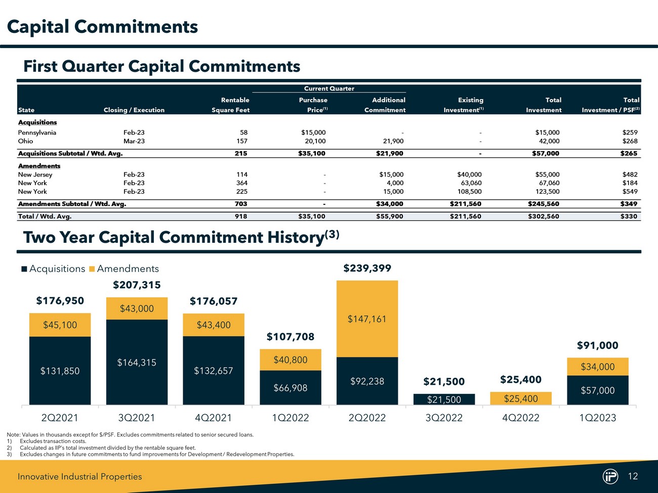 Innovative Industrial Properties 15 Square Feet Invested / Committed Capital $ Date % Under Dev. Total $ / #Tenant State City Acquired Leased In Place (1) / Redev. (2) Total Invested Committed Total $ Square Feet Industrial 1PharmaCann New York Hamptonburgh 12/19/2016 100% 74 151 225 $103,861 $19,639 $123,500 $549 2PharmaCann Michigan Warren 10/9/2019 100% 205 - 205 83,045 550 83,595 408 3PharmaCann Massachusetts Holliston 5/31/2018 100% 58 - 58 30,500 - 30,500 526 4PharmaCann Illinois Dwight 10/30/2019 100% 66 - 66 28,000 - 28,000 424 5PharmaCann Pennsylvania Scott Township 8/7/2019 100% 56 - 56 28,000 - 28,000 500 6PharmaCann Ohio Buckeye Lake Village 3/13/2019 100% 58 - 58 20,000 - 20,000 345 7Ascend Wellness (AWH) Illinois Barry 12/21/2018 100% 166 - 166 71,000 - 71,000 428 8Ascend Wellness (AWH) Massachusetts Athol 4/2/2020 100% 199 - 199 63,900 - 63,900 321 9Ascend Wellness (AWH) New Jersey Franklin 2/10/2022 100% 114 - 114 53,040 1,960 55,000 482 10Ascend Wellness (AWH) Michigan Lansing 7/2/2019 100% 145 - 145 24,150 - 24,150 167 11Green Thumb Industries Pennsylvania Danville 11/12/2019 100% 300 - 300 94,600 - 94,600 315 12Green Thumb Industries Illinois Oglesby 3/6/2020 100% 266 - 266 50,000 - 50,000 188 13Green Thumb Industries Ohio Toledo 1/31/2020 100% 98 - 98 32,200 - 32,200 329 14Parallel Pennsylvania Pittsburgh 5/13/2021 100% 239 - 239 67,750 - 67,750 283 15Parallel Florida Lakeland 9/18/2020 100% 220 - 220 56,400 - 56,400 256 16Parallel Florida Wimauma 3/11/2020 100% 373 - 373 51,500 - 51,500 138 17Curaleaf Pennsylvania Chambersburg 12/20/2019 100% 179 - 179 53,661 7,979 61,640 344 18Curaleaf Illinois Litchfield 10/30/2019 100% 127 - 127 40,000 - 40,000 315 19Curaleaf New Jersey Blue Anchor 7/13/2020 100% 123 - 123 35,000 - 35,000 285 20Curaleaf Massachusetts Webster 9/1/2022 100% 104 - 104 21,500 - 21,500 207 21Curaleaf North Dakota Fargo 12/20/2019 100% 33 - 33 12,190 - 12,190 369 22Columbia Care Pennsylvania Saxton 5/20/2019 100% 270 - 270 42,891 109 43,000 159 23Columbia Care Virginia Richmond 1/15/2020 100% 82 - 82 19,750 - 19,750 241 24Columbia Care New Jersey Vineland 7/16/2020 100% 50 - 50 11,820 - 11,820 236 25Columbia Care Colorado Denver 10/30/2018 100% 58 - 58 11,250 - 11,250 194 26Columbia Care Colorado Denver 12/14/2021 100% 18 - 18 9,917 - 9,917 551 27Columbia Care Colorado Denver 12/14/2021 100% 12 - 12 3,276 - 3,276 273 28Trulieve Massachusetts Holyoke 7/26/2019 100% 150 - 150 43,500 - 43,500 290 29Trulieve Florida Alachua 1/22/2021 100% 295 - 295 41,650 - 41,650 141 30Trulieve Maryland Hancock 8/13/2021 100% 115 - 115 28,901 614 29,515 257 31Trulieve Florida Quincy 10/23/2019 100% 120 - 120 17,000 - 17,000 142 32Trulieve* Nevada Las Vegas 7/12/2019 100% 43 - 43 9,600 - 9,600 223 33Trulieve Arizona Cottonwood 4/27/2022 100% 17 - 17 5,238 - 5,238 308 34Holistic Industries Maryland Capitol Heights 5/26/2017 100% 72 - 72 33,719 31 33,750 469 35Holistic Industries Pennsylvania New Castle 6/10/2020 100% 108 - 108 24,396 1,254 25,650 238 36Holistic Industries Massachusetts Monson 7/12/2018 100% 55 - 55 19,641 109 19,750 359 37Cresco Labs Michigan Marshall 4/22/2020 100% 115 - 115 32,000 - 32,000 278 38Cresco Labs Illinois Kankakee 10/22/2019 100% 51 - 51 25,496 104 25,600 502 39Cresco Labs Illinois Joliet 10/22/2019 100% 39 - 39 20,950 - 20,950 537 40Cresco Labs Ohio Yellow Springs 1/24/2020 100% 50 - 50 12,927 618 13,545 271 414Front Ventures Illinois Matteson 8/3/2021 100% - 250 250 55,748 14,402 70,150 281 424Front Ventures Washington Olympia 12/17/2020 100% 114 - 114 17,500 - 17,500 154 434Front Ventures** Massachusetts Holliston 1/28/2022 100% 57 - 57 16,000 - 16,000 281 444Front Ventures Massachusetts Georgetown 12/17/2020 100% 67 - 67 15,500 - 15,500 231 45Goodness Growth (f/k/a Vireo Health) New York Perth 10/23/2017 100% 40 324 364 64,709 2,351 67,060 184 46Goodness Growth (f/k/a Vireo Health) Minnesota Otsego 11/8/2017 100% 89 - 89 9,710 - 9,710 109 47Gold Flora California Desert Hot Springs 10/15/2021 100% 166 35 201 62,827 673 63,500 316 Note : Subtotals and Totals include fractional amounts . Square footage and dollars in thousands except for $ /PSF . “Industrial” reflects facilities utilized or expected to be utilized for regulated cannabis cultivation, processing and/or distribution activities, which can consist of industrial and/or greenhouse space . Data as of March 31 , 2023 . *Harvest Health & Recreation Inc . , which is a subsidiary of Trulieve Inc . , executed a lease guaranty in favor of IIP for tenant’s obligations at the property . **The acquisition of the property did not satisfy the requirements for sale - leaseback accounting and therefore, the transaction is recognized as a note receivable and is included in other assets, net on our consolidated balance sheet . 1) Existing square footage for properties where there is no active development or redevelopment . 2) Estimated square footage upon completion of development or redevelopment . Property List