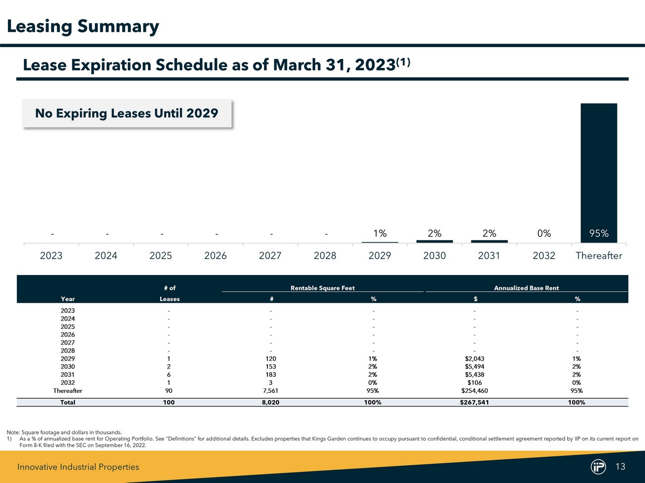 Innovative Industrial Properties 12 Current Quarter Rentable Purchase Additional Existing Total Total State Closing / Execution Square Feet Price (1) Commitment Investment (1) Investment Investment / PSF (2) Acquisitions Pennsylvania Feb-23 58 $15,000 - - $15,000 $259 Ohio Mar-23 157 20,100 21,900 - 42,000 $268 Acquisitions Subtotal / Wtd. Avg. 215 $35,100 $21,900 - $57,000 $265 Amendments New Jersey Feb-23 114 - $15,000 $40,000 $55,000 $482 New York Feb-23 364 - 4,000 63,060 67,060 $184 New York Feb-23 225 - 15,000 108,500 123,500 $549 Amendments Subtotal / Wtd. Avg. 703 - $34,000 $211,560 $245,560 $349 Total / Wtd. Avg. 918 $35,100 $55,900 $211,560 $302,560 $330 Capital Commitments First Quarter Capital Commitments Two Year Capital Commitment History (3) Note : Values in thousands except for $ /PSF . Excludes commitments related to senior secured loans . 1) Excludes transaction costs . 2) Calculated as IIP’s total investment divided by the rentable square feet . 3) Excludes changes in future commitments to fund improvements for Development / Redevelopment Properties . $131,850 $164,315 $132,657 $66,908 $92,238 $21,500 - $57,000 $45,100 $43,000 $43,400 $40,800 $147,161 - $25,400 $34,000 $176,950 $207,315 $176,057 $107,708 $239,399 $21,500 $25,400 $91,000 2Q2021 3Q2021 4Q2021 1Q2022 2Q2022 3Q2022 4Q2022 1Q2023 Acquisitions Amendments