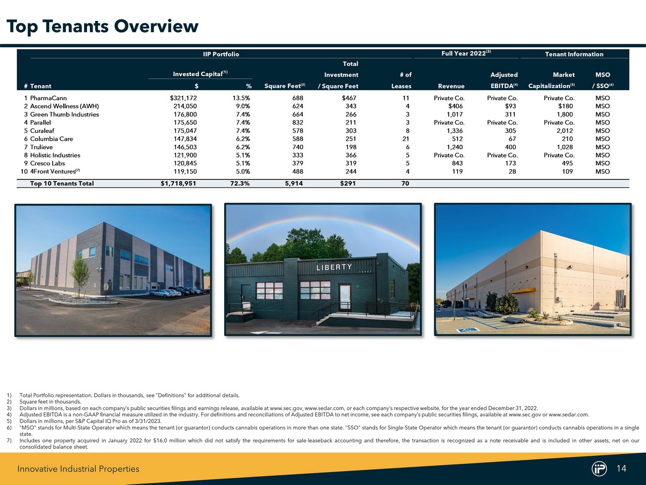 Innovative Industrial Properties 14 IIP Portfolio Full Year 2022 (3) Tenant Information Total Invested Capital (1) Investment # of Adjusted Market MSO #Tenant $ % Square Feet (2) / Square Feet Leases Revenue EBITDA (4) Capitalization (5) / SSO (6) 1PharmaCann $321,172 13.5% 688 $467 11 Private Co. Private Co. Private Co. MSO 2Ascend Wellness (AWH) 214,050 9.0% 624 343 4 $406 $93 $180 MSO 3Green Thumb Industries 176,800 7.4% 664 266 3 1,017 311 1,800 MSO 4Parallel 175,650 7.4% 832 211 3 Private Co. Private Co. Private Co. MSO 5Curaleaf 175,047 7.4% 578 303 8 1,336 305 2,012 MSO 6Columbia Care 147,834 6.2% 588 251 21 512 67 210 MSO 7Trulieve 146,503 6.2% 740 198 6 1,240 400 1,028 MSO 8Holistic Industries 121,900 5.1% 333 366 5 Private Co. Private Co. Private Co. MSO 9Cresco Labs 120,845 5.1% 379 319 5 843 173 495 MSO 10 4Front Ventures (7) 119,150 5.0% 488 244 4 119 28 109 MSO Top 10 Tenants Total $1,718,951 72.3% 5,914 $291 70 Top Tenants Overview 1) Total Portfolio representation . Dollars in thousands, see “Definitions” for additional details . 2) Square feet in thousands . 3) Dollars in millions, based on each company’s public securities filings and earnings release, available at www . sec . gov, www . sedar . com, or each company’s respective website, for the year ended December 31 , 2022 . 4) Adjusted EBITDA is a non - GAAP financial measure utilized in the industry . For definitions and reconciliations of Adjusted EBITDA to net income, see each company’s public securities filings, available at www . sec . gov or www . sedar . com . 5) Dollars in millions, per S&P Capital IQ Pro as of 3 / 31 / 2023 . 6) “MSO” stands for Multi - State Operator which means the tenant (or guarantor) conducts cannabis operations in more than one state . “SSO” stands for Single - State O perator which means the tenant (or guarantor) conducts cannabis operations in a single state . 7) Includes one property acquired in January 2022 for $ 16 . 0 million which did not satisfy the requirements for sale - leaseback accounting and therefore, the transaction is recognized as a note receivable and is included in other assets, net on our consolidated balance sheet .