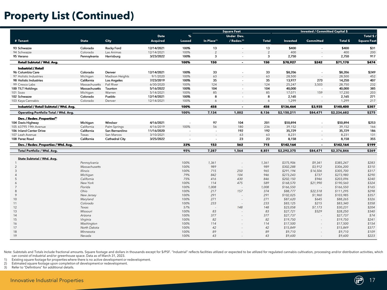 Innovative Industrial Properties 16 Square Feet Invested / Committed Capital $ Date % Under Dev. Total $ / #Tenant State City Acquired Leased In Place (1) / Redev. (2) Total Invested Committed Total $ Square Feet 48TILT Holdings Pennsylvania White Haven 2/15/2023 100% 58 - 58 $15,000 - $15,000 $259 49Jushi Pennsylvania Scranton 4/6/2018 100% 145 - 145 45,800 - 45,800 316 50Battle Green Ohio Columbus 3/3/2023 100% - 157 157 20,100 21,900 42,000 268 51Kings Garden California North Palm Springs 5/12/2020 100% 70 - 70 17,500 - 17,500 250 52Kings Garden California Palm Springs 4/16/2019 100% 24 - 24 6,309 - 6,309 263 53Kings Garden California Palm Springs 4/16/2019 100% 22 - 22 5,788 - 5,788 263 54Calyx Peak Missouri Smithville 9/17/2021 100% 83 - 83 27,721 529 28,250 340 55Green Peak (Skymint) Michigan Dimondale 8/2/2018 100% 56 - 56 15,799 - 15,799 282 56Temescal Wellness Massachusetts North Adams 5/26/2021 100% 71 - 71 26,500 300 26,800 377 57Maryland Cultivation Processing (MCP) Maryland Hagerstown 4/13/2022 100% 84 - 84 25,000 - 25,000 298 58The Pharm Arizona Willcox 12/15/2017 100% 358 - 358 20,000 - 20,000 56 59Texas Original Texas Bastrop 6/14/2022 100% - 85 85 14,827 7,173 22,000 259 60Sacramento CA (Undisclosed Tenant) California Sacramento 2/8/2019 100% 43 - 43 12,710 - 12,710 296 61Emerald Growth Michigan Harrison Township 6/7/2019 100% 45 - 45 10,000 - 10,000 222 62AYR Wellness Ohio Akron 5/14/2019 100% 11 - 11 3,550 - 3,550 323 Industrial Subtotal / Wtd. Avg. 100% 6,526 1,002 7,528 $1,942,819 $80,293 $2,023,112 $269 Retail 63PharmaCann Colorado Commerce City 2/21/2020 100% 5 - 5 $2,300 - $2,300 $460 64PharmaCann Colorado Aurora 12/14/2021 100% 2 - 2 1,558 116 1,674 837 65PharmaCann Colorado Berthoud 12/14/2021 100% 6 - 6 1,307 99 1,406 234 66PharmaCann Colorado Mancos 12/14/2021 100% 4 - 4 1,148 - 1,148 287 67PharmaCann Colorado Pueblo 2/19/2020 100% 3 - 3 1,049 - 1,049 350 68Curaleaf North Dakota Dickinson 12/14/2021 100% 5 - 5 2,045 - 2,045 409 69Curaleaf North Dakota Devils Lake 12/14/2021 100% 4 - 4 1,614 - 1,614 404 70Curaleaf Pennsylvania Bradford 12/14/2021 100% 3 - 3 1,058 - 1,058 353 71Columbia Care Colorado Denver 12/14/2021 100% 4 - 4 7,338 - 7,338 1,834 72Columbia Care Colorado Pueblo 12/14/2021 100% 6 - 6 4,878 - 4,878 813 73Columbia Care Colorado Aurora 12/14/2021 100% 5 - 5 4,229 - 4,229 846 74Columbia Care Colorado Glenwood Springs 12/14/2021 100% 4 - 4 4,187 - 4,187 1,047 75Columbia Care Colorado Fort Collins 12/14/2021 100% 5 - 5 3,977 - 3,977 795 76Columbia Care Colorado Aurora 12/14/2021 100% 4 - 4 3,601 - 3,601 900 77Columbia Care New Jersey Vineland 7/16/2020 100% 4 - 4 2,165 - 2,165 541 78Columbia Care Colorado Aurora 12/14/2021 100% 5 - 5 1,991 - 1,991 398 79Columbia Care Colorado Englewood 12/14/2021 100% 4 - 4 1,778 - 1,778 445 80Columbia Care Colorado Trinidad 12/14/2021 100% 9 - 9 1,728 - 1,728 192 81Columbia Care Colorado Silver Plume 12/14/2021 100% 4 - 4 1,444 - 1,444 361 82Columbia Care Colorado Black Hawk 12/14/2021 100% 4 - 4 1,321 - 1,321 330 83Columbia Care Colorado Edgewater 12/14/2021 100% 5 - 5 1,089 - 1,089 218 84Columbia Care Colorado Sheridan 12/14/2021 100% 2 - 2 890 - 890 445 85Green Peak (Skymint) Michigan East Lansing 10/25/2019 100% 3 - 3 3,372 28 3,400 1,133 86Green Peak (Skymint) Michigan Lansing 11/4/2019 100% 14 - 14 2,225 - 2,225 159 87Green Peak (Skymint) Michigan Flint 11/4/2019 100% 6 - 6 2,180 - 2,180 363 88Green Peak (Skymint) Michigan Bay City 11/4/2019 100% 4 - 4 1,740 - 1,740 435 89Green Peak (Skymint) Michigan Traverse City 11/25/2019 100% 2 - 2 1,272 - 1,272 636 90Green Peak (Skymint) Michigan Newaygo 11/8/2019 100% 2 - 2 995 - 995 498 91The Pharm Arizona Phoenix 9/19/2019 100% 2 - 2 2,500 - 2,500 1,250 92Schwazze Colorado Ordway 12/14/2021 100% 2 - 2 400 - 400 200 Property List (Continued) Note : Subtotals and Totals include fractional amounts . Square footage and dollars in thousands except for $ /PSF . “Industrial” reflects facilities utilized or expected to be utilized for regulated cannabis cultivation, processing and/or distribution activities, which can consist of industrial and/or greenhouse space . Data as of March 31 , 2023 . 1) Existing square footage for properties where there is no active development or redevelopment . 2) Estimated square footage upon completion of development or redevelopment .