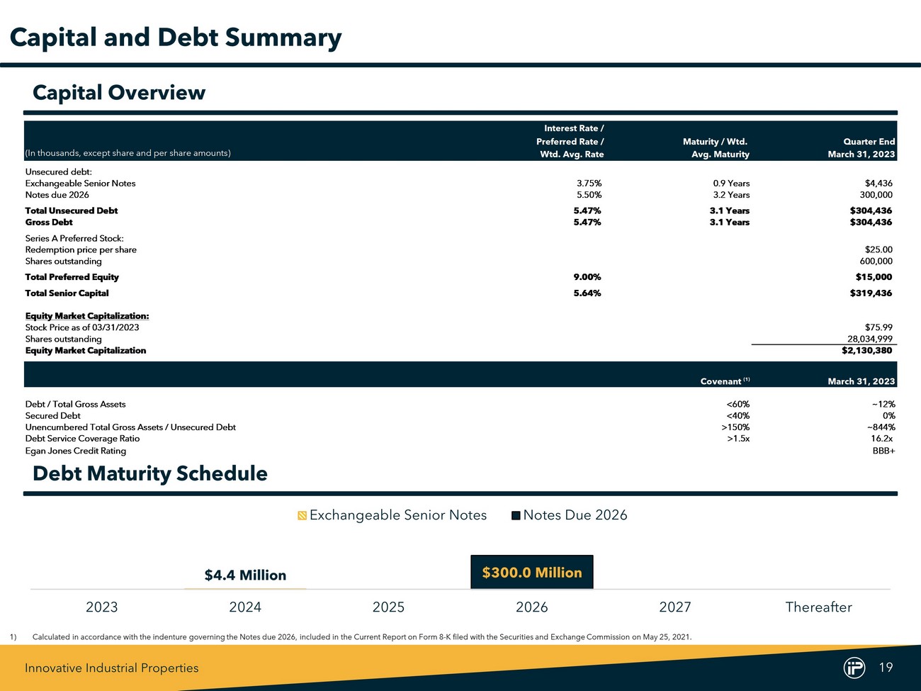 Innovative Industrial Properties 18 Date Maturity / Wtd. Loan #City State Loan Type Executed Avg. Maturity Total $ 1 Coachella (1) California Senior Secured 6/25/2021 0.8 Years $23,000 2 Needles (2) California Senior Secured 3/3/2023 4.9 Years 16,100 Loan Portfolio Total / Wtd. Avg. 2.5 Years $39,100 Secured Loans Note : Loan list maturity does not include available loan extensions . 1) As of March 31 , 2023 , we had funded approximately $ 18 . 4 million of the construction loan . 2) Relates to the seller - financed note issued to us by the buyer in connection with our disposition of a portfolio of four properties in southern California previously leased to Vertical . The transaction did not qualify for recognition as a completed sale in accordance with GAAP and therefore, we have not derecognized the assets transferred and have not recognized the seller - financed note on our consolidated balance sheet .
