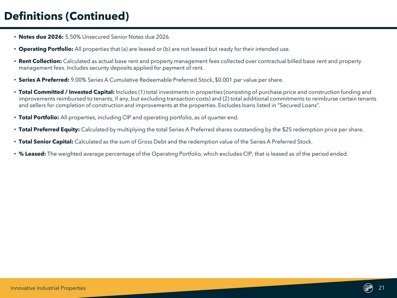 Innovative Industrial Properties 20 Definitions • Adjusted Funds From Operations (“AFFO”): Management believes that AFFO and AFFO per share are appropriate supplemental measures of a REIT’s operating performance. We calculate AFFO by adjusting Normalized FFO for certain cash and non - cash items. • Annualized Base Rent (“ABR”): ABR is calculated by multiplying rental payments (defined as the contractually due base rents and property management fees for the last month in the quarter), by twelve. • Development / Redevelopment (“Dev. / Redev.”) Properties: Defined as non - operating assets under development that are not leased and not ready for their intended use. • Exchangeable Senior Notes: 3.75% E xchangeable Senior Notes due 2024. • Funds From Operations (“FFO”): FFO and FFO per share are operating performance measures adopted by the National Association of Real Estate Investment Trusts, Inc. (“NAREIT”). NAREIT defines FFO as the most commonly accepted and reported measure of a REIT’s ope rating performance equal to net income (computed in accordance with GAAP), excluding gains (or losses) from sales of property, depre cia tion, amortization and impairment related to real estate properties, and after adjustments for unconsolidated partnerships and join t v entures. Management believes that net income, as defined by GAAP, is the most appropriate earnings measurement. However, management be lie ves FFO and FFO per share to be supplemental measures of a REIT’s performance because they provide an understanding of the operat ing performance of our properties without giving effect to certain significant non - cash items, primarily depreciation expense. Histo rical cost accounting for real estate assets in accordance with GAAP assumes that the value of real estate assets diminishes predictably ov er time. However, real estate values instead have historically risen or fallen with market conditions. We believe that by excluding the effect of depreciation, FFO and FFO per share can facilitate comparisons of operating performance between periods. We report FFO and FFO per share because th ese measures are observed by management to also be the predominant measures used by the REIT industry and by industry analysts to ev aluate REITs and because FFO per share is consistently reported, discussed, and compared by research analysts in their notes and pub lic ations about REITs. For these reasons, management has deemed it appropriate to disclose and discuss FFO and FFO per share. • GAAP: Accounting principles generally accepted in the United States. • Gross Debt: Calculated as the sum of the principal amount outstanding of the Notes due 2026 and Exchangeable Senior Notes. • Normalized Funds From Operations (“Normalized FFO”): We compute normalized funds from operations (“Normalized FFO”) by adjusting FFO, as defined by NAREIT, to exclude certain GAAP income and expense amounts that we believe are infrequent and unusual in n atu re and/or not related to our core real estate operations. Exclusion of these items from similar FFO - type metrics is common within the equi ty REIT industry, and management believes that presentation of Normalized FFO and Normalized FFO per share provides investors with a metric to ass ist in their evaluation of our operating performance across multiple periods and in comparison to the operating performance of other compa nie s, because it removes the effect of unusual items that are not expected to impact our operating performance on an ongoing basis. Normali zed FFO is used by management in evaluating the performance of our core business operations. Items included in calculating FFO that may be ex clu ded in calculating Normalized FFO include certain transaction - related gains, losses, income or expense or other non - core amounts as the y occur.