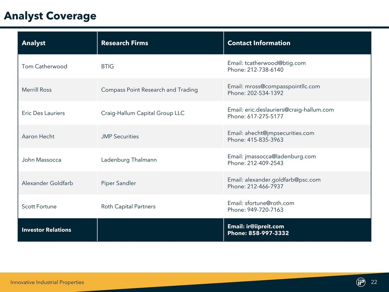 Innovative Industrial Properties 22 Analyst Coverage Analyst Research Firms Contact Information Tom Catherwood BTIG Email: tcatherwood@btig.com Phone: 212 - 738 - 6140 Merrill Ross Compass Point Research and Trading Email: mross@compasspointllc.com Phone: 202 - 534 - 1392 Eric Des Lauriers Craig - Hallum Capital Group LLC Email: eric.deslauriers@craig - hallum.com Phone: 617 - 275 - 5177 Aaron Hecht JMP Securities Email: ahecht@jmpsecurities.com Phone: 415 - 835 - 3963 John Massocca Ladenburg Thalmann Email: jmassocca@ladenburg.com Phone: 212 - 409 - 2543 Alexander Goldfarb Piper Sandler Email: alexander.goldfarb@psc.com Phone: 212 - 466 - 7937 Scott Fortune Roth Capital Partners Email: sfortune@roth.com Phone: 949 - 720 - 7163 Investor Relations Email: ir@iipreit.com Phone: 858 - 997 - 3332