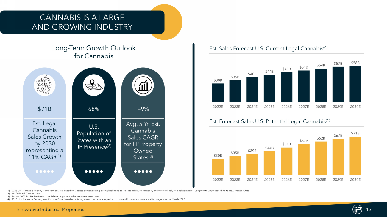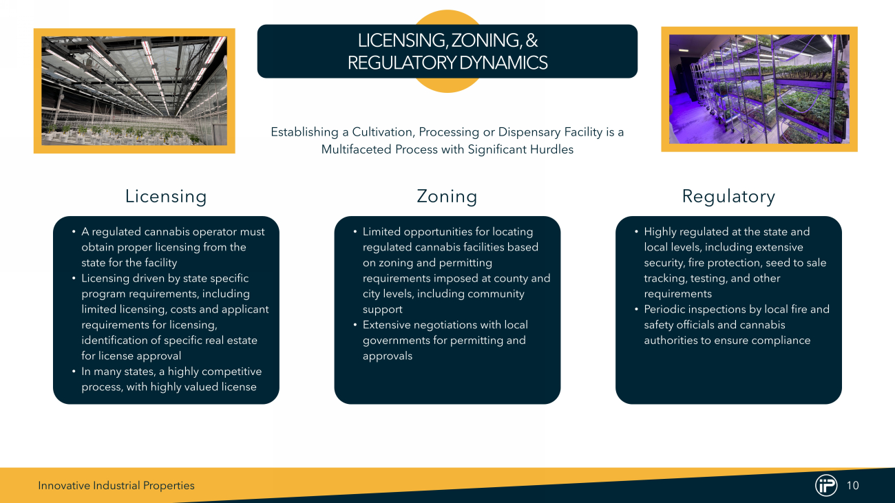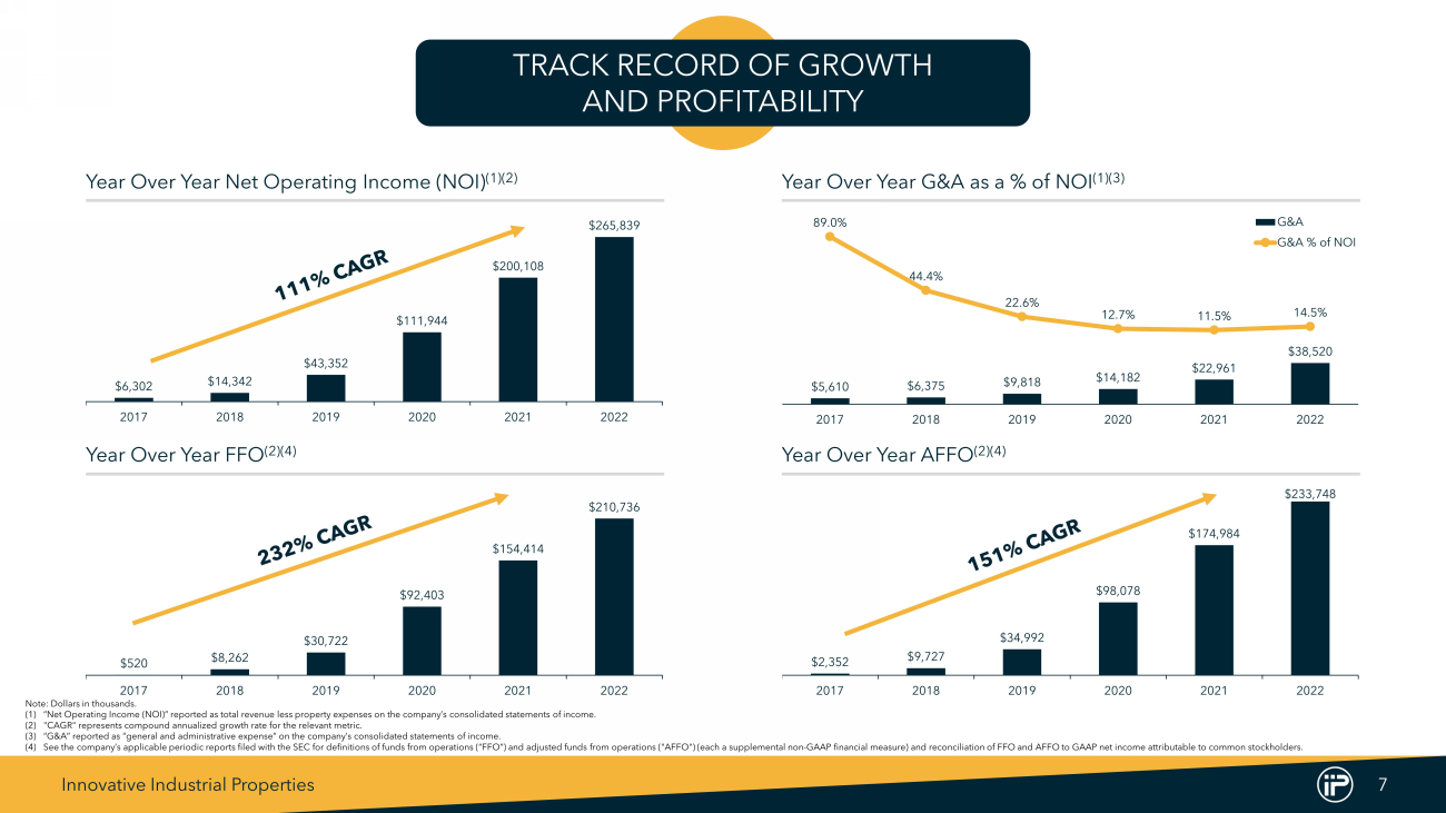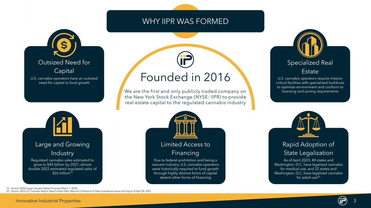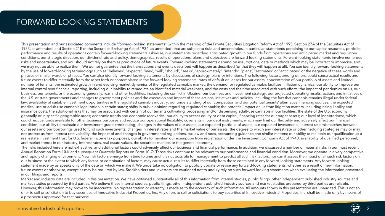 Innovative Industrial Properties 2 FORWARD LOOKING STATEMENTS This presentation and our associated comments include "forward - looking statements" (within the meaning of the Private Securities Litigation Reform Act of 1995, Section 27A of the Securities Act of 1933, as amended, and Section 21E of the Securities Exchange Act of 1934, as amended) that are subject to risks and uncertain tie s. In particular, statements pertaining to our capital resources, portfolio performance and results of operations contain forward - looking statements. Likewise, our statements regarding anticipated growth in our funds from operations and anticipated market and regulatory conditions, our strategic direction, our dividend rate and policy, demographics, results of operations, plans and objectives are forward - looking statements. Forward - looking statements involve numerous risks and uncertainties, and you should not rely on them as predictions of future events. Forward - looking statements depend on a ssumptions, data or methods which may be incorrect or imprecise, and we may not be able to realize them. We do not guarantee that the transactions and events described will happen as described ( or that they will happen at all). You can identify forward - looking statements by the use of forward - looking terminology such as "believes“, "expects“, "may“, "will“, "should“, "seeks“, "approximately“, "int ends“, "plans“, "estimates" or "anticipates" or the negative of these words and phrases or similar words or phrases. You can also identify forward - looking statements by discussions of strategy, plans or inten tions. The following factors, among others, could cause actual results and future events to differ materially from those set forth or contemplated in the forward - looking statements: rates of default on l eases for our assets; concentration of our portfolio of assets and limited number of tenants; the estimated growth in and evolving market dynamics of the regulated cannabis market; the demand for regu lat ed cannabis facilities; inflation dynamics; our ability to improve our internal control over financial reporting, including our inability to remediate an identified material weakness, and the cost s a nd the time associated with such efforts; the impact of pandemics on us, our business, our tenants, or the economy generally; war and other hostilities, including the conflict in Ukraine; our business a nd investment strategy; our projected operating results; actions and initiatives of the U.S. or state governments and changes to government policies and the execution and impact of these actions, initiatives a nd policies, including the fact that cannabis remains illegal under federal law; availability of suitable investment opportunities in the regulated cannabis industry; our understanding of our competiti on and our potential tenants’ alternative financing sources; the expected medical - use or adult - use cannabis legalization in certain states; shifts in public opinion regarding regulated cannabis; the pot ential impact on us from litigation matters, including rising liability and insurance costs; the additional risks that may be associated with certain of our tenants cultivating, processing and/or dispe nsi ng adult - use cannabis in our facilities; the state of the U.S. economy generally or in specific geographic areas; economic trends and economic recoveries; our ability to access equity or debt capi tal ; financing rates for our target assets; our level of indebtedness, which could reduce funds available for other business purposes and reduce our operational flexibility; covenants in our debt instru men ts, which may limit our flexibility and adversely affect our financial condition; our ability to maintain our investment grade credit rating; changes in the values of our assets; our expected port fol io of assets; our expected investments; interest rate mismatches between our assets and our borrowings used to fund such investments; changes in interest rates and the market value of our assets; th e d egree to which any interest rate or other hedging strategies may or may not protect us from interest rate volatility; the impact of and changes in governmental regulations, tax law and rates, accou nti ng guidance and similar matters; our ability to maintain our qualification as a real estate investment trust for U.S. federal income tax purposes; our ability to maintain our exemption from registration un der the Investment Company Act of 1940; availability of qualified personnel; and market trends in our industry, interest rates, real estate values, the securities markets or the general economy. The risks included here are not exhaustive, and additional factors could adversely affect our business and financial performa nce . In addition, we discussed a number of material risks in our most recent Annual Report on Form 10 - K and subsequent Quarterly Reports on Form 10 - Q. Those risks continue to be relevant to our performance and financial condition. Moreover, we operate in a very competitive and rapidly changing environment. New risk factors emerge from time to time and it is not possible for management to predict all such risk factors, nor can it assess the impact of all such risk factors on our business or the extent to which any factor, or combination of factors, may cause actual results to differ materially from th ose contained in any forward - looking statements. Any forward - looking statement made by us speaks only of the date on which we make it. We undertake no obligation to publicly update or revise any fo rward - looking statements, whether as a result of new information, future events or otherwise, except as may be required by law. Stockholders and investors are cautioned not to unduly rely on suc h forward - looking statements when evaluating the information presented in our filings and reports. Market and industry data are included in this presentation. We have ob