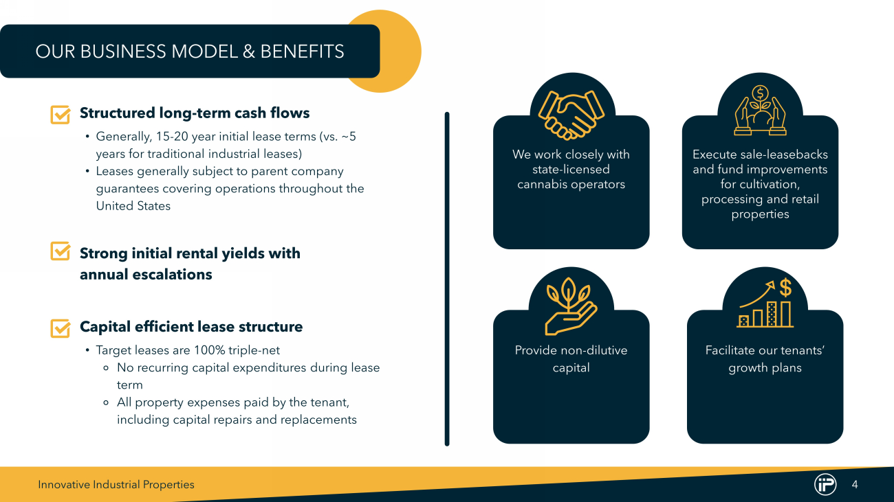 Innovative Industrial Properties 3 Founded in 2016 We are the first and only publicly traded company on the New York Stock Exchange (NYSE: IIPR) to provide real estate capital to the regulated cannabis industry WHY IIPR WAS FORMED Specialized Real Estate U.S. cannabis operators require mission critical facilities with specialized buildouts to optimize environment and conform to licensing and zoning requirements Outsized Need for Capital U.S. cannabis operators have an outsized need for capital to fund growth Rapid Adoption of State Legalization As of April 2023, 40 states and Washington, D.C. have legalized cannabis for medical - use, and 22 states and Washington, D.C. have legalized cannabis for adult - use (2) Large and Growing Industry Regulated cannabis sales estimated to grow to $45 billion by 2027, almost double 2022 estimated regulated sales of $26 billion (1) Limited Access to Financing Due to federal prohibition and being a nascent industry, U.S. cannabis operators were historically required to fund growth through highly dilutive forms of capital absent other forms of financing (1) Source : BDSA Legal Cannabis Market Forecast (March 7 , 2023 ) . (2) Source : 2023 U . S . Cannabis Report, New Frontier Data, National Conference of State Legislatures (www . ncsl . org) as of April 24 , 2023 .