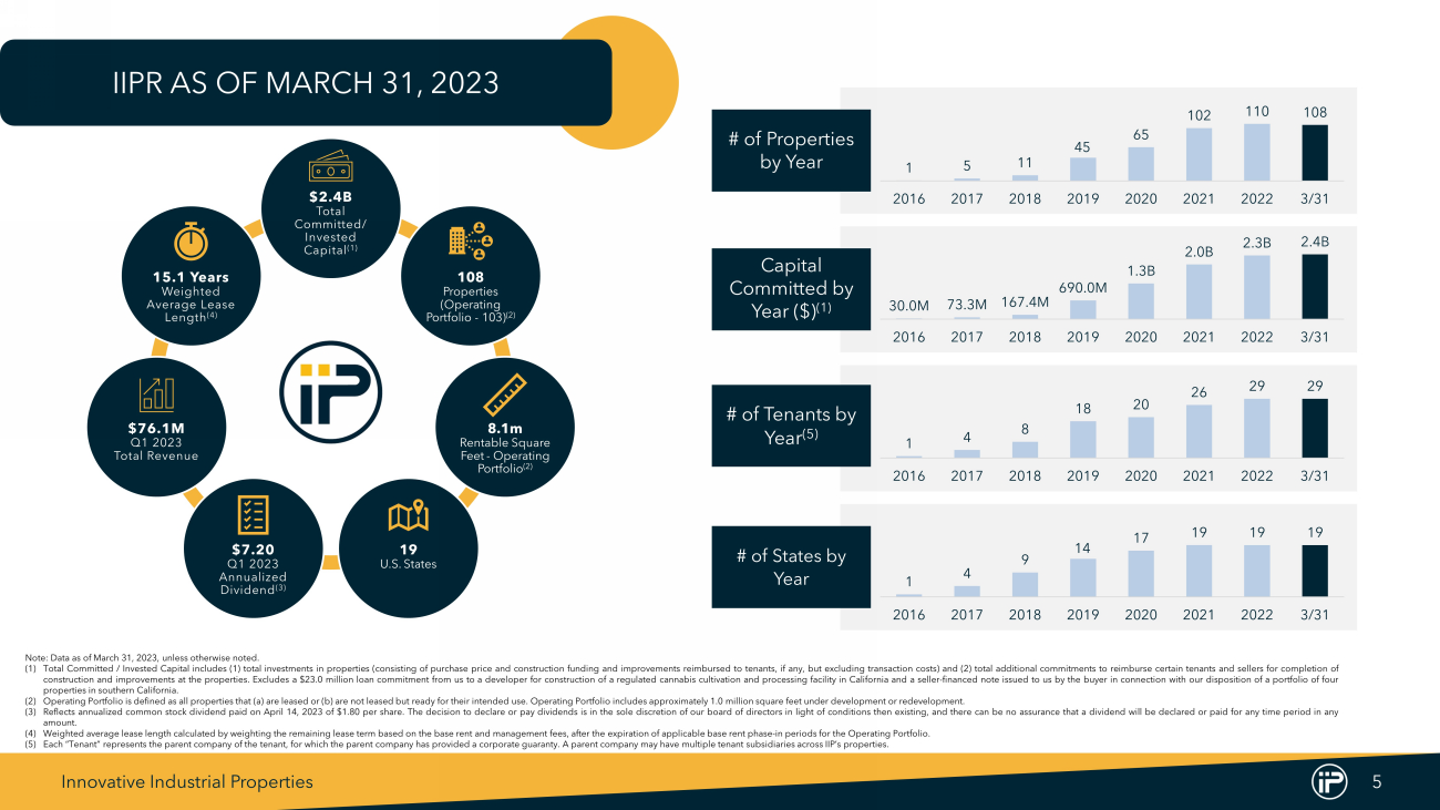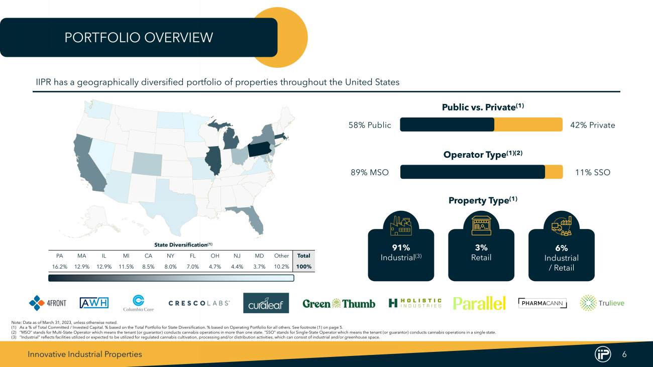 Innovative Industrial Properties 5 # of Tenants by Yea r (5) # of Properties by Year # of States by Year 1 4 9 14 17 19 19 19 2016 2017 2018 2019 2020 2021 2022 3/31 1 4 8 18 20 26 29 29 2016 2017 2018 2019 2020 2021 2022 3/31 Capital Committed by Year ($) (1) 30.0M 73.3M 167.4M 690.0M 1.3B 2.0B 2.3B 2.4B 2016 2017 2018 2019 2020 2021 2022 3/31 IIPR AS OF MARCH 31, 2023 Note : Data as of March 31 , 2023 , unless otherwise noted . (1) Total Committed / Invested Capital includes ( 1 ) total investments in properties (consisting of purchase price and construction funding and improvements reimbursed to tenants, if any, but excluding transaction costs) and ( 2 ) total additional commitments to reimburse certain tenants and sellers for completion of construction and improvements at the properties . Excludes a $ 23 . 0 million loan commitment from us to a developer for construction of a regulated cannabis cultivation and processing facility in California and a seller - financed note issued to us by the buyer in connection with our disposition of a portfolio of four properties in southern California . (2) Operating Portfolio is defined as all properties that (a) are leased or (b) are not leased but ready for their intended use . Operating Portfolio includes approximately 1 . 0 million square feet under development or redevelopment . (3) Reflects annualized common stock dividend paid on April 14 , 2023 of $ 1 . 80 per share . The decision to declare or pay dividends is in the sole discretion of our board of directors in light of conditions then existing, and there can be no assurance that a dividend will be declared or paid for any time period in any amount . (4) Weighted average lease length calculated by weighting the remaining lease term based on the base rent and management fees, after the expiration of applicable base rent phase - in periods for the Operating Portfolio . (5) Each “Tenant” represents the parent company of the tenant, for which the parent company has provided a corporate guaranty . A parent company may have multiple tenant subsidiaries across IIP’s properties . $2.4B Total Committed/ Invested Capital (1) 108 Properties (Operating Portfolio - 103) (2) 8.1m Rentable Square Feet - Operating Portfolio (2) 19 U.S. States $7.20 Q1 2023 Annualized Dividend (3) $76.1M Q1 2023 Total Revenue 15.1 Years Weighted Average Lease Length (4) 1 5 11 45 65 102 110 108 2016 2017 2018 2019 2020 2021 2022 3/31