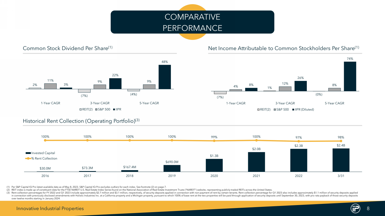 Innovative Industrial Properties 7 TRACK RECORD OF GROWTH AND PROFITABILITY Note : Dollars in thousands . (1) “Net Operating Income (NOI)” reported as total revenue less property expenses on the company’s consolidated statements of income . (2) "CAGR" represents compound annualized growth rate for the relevant metric . (3) “G&A” reported as “general and administrative expense” on the company’s consolidated statements of income . (4) See the company’s applicable periodic reports filed with the SEC for definitions of funds from operations (“FFO”) and adjusted funds from operations ("AFFO") (each a supplemental non - GAAP financial measure) and reconciliation of FFO and AFFO to GAAP net income attributable to common stockholders . $2,352 $9,727 $34,992 $98,078 $174,984 $233,748 2017 2018 2019 2020 2021 2022 Year Over Year AFFO (2)(4) Year Over Year G&A as a % of NOI (1)(3) $5,610 $6,375 $9,818 $14,182 $22,961 $38,520 89.0% 44.4% 22.6% 12.7% 11.5% 14.5% 2017 2018 2019 2020 2021 2022 G&A G&A % of NOI Year Over Year FFO (2)(4) $520 $8,262 $30,722 $92,403 $154,414 $210,736 2017 2018 2019 2020 2021 2022 Year Over Year Net Operating Income (NOI) (1)(2) $6,302 $14,342 $43,352 $111,944 $200,108 $265,839 2017 2018 2019 2020 2021 2022