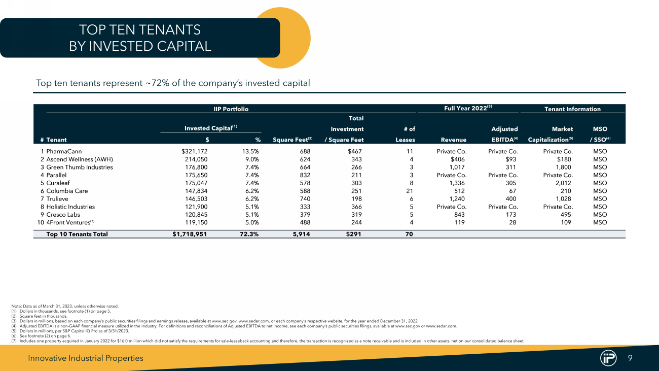 Innovative Industrial Properties 9 IIP Portfolio Full Year 2022 (3) Tenant Information Total Invested Capital (1) Investment # of Adjusted Market MSO #Tenant $ % Square Feet (2) / Square Feet Leases Revenue EBITDA (4) Capitalization (5) / SSO (6) 1PharmaCann $321,172 13.5% 688 $467 11 Private Co. Private Co. Private Co. MSO 2Ascend Wellness (AWH) 214,050 9.0% 624 343 4 $406 $93 $180 MSO 3Green Thumb Industries 176,800 7.4% 664 266 3 1,017 311 1,800 MSO 4Parallel 175,650 7.4% 832 211 3 Private Co. Private Co. Private Co. MSO 5Curaleaf 175,047 7.4% 578 303 8 1,336 305 2,012 MSO 6Columbia Care 147,834 6.2% 588 251 21 512 67 210 MSO 7Trulieve 146,503 6.2% 740 198 6 1,240 400 1,028 MSO 8Holistic Industries 121,900 5.1% 333 366 5 Private Co. Private Co. Private Co. MSO 9Cresco Labs 120,845 5.1% 379 319 5 843 173 495 MSO 10 4Front Ventures (7) 119,150 5.0% 488 244 4 119 28 109 MSO Top 10 Tenants Total $1,718,951 72.3% 5,914 $291 70 TOP TEN TENANTS BY INVESTED CAPITAL Note : Data as of March 31 , 2023 , unless otherwise noted . (1) Dollars in thousands, see footnote ( 1 ) on page 5 . (2) Square feet in thousands . (3) Dollars in millions, based on each company’s public securities filings and earnings release, available at www . sec . gov, www . sedar . com, or each company’s respective website, for the year ended December 31 , 2022 . (4) Adjusted EBITDA is a non - GAAP financial measure utilized in the industry . For definitions and reconciliations of Adjusted EBITDA to net income, see each company’s public securities filings, available at www . sec . gov or www . sedar . com . (5) Dollars in millions, per S&P Capital IQ Pro as of 3 / 31 / 2023 . (6) See footnote ( 2 ) on page 6 . (7) Includes one property acquired in January 2022 for $ 16 . 0 million which did not satisfy the requirements for sale - leaseback accounting and therefore, the transaction is recognized as a note receivable and is included in other assets, net on our consolidated balance sheet . Top ten tenants represent ~72% of the company’s invested capital