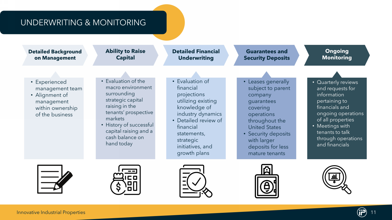 Innovative Industrial Properties 11 UNDERWRITING & MONITORING • Evaluation of financial projections utilizing existing knowledge of industry dynamics • Detailed review of financial statements, strategic initiatives, and growth plans • Experienced management team • Alignment of management within ownership of the business Detailed Background on Management Ability to Raise Capital Detailed Financial Underwriting Guarantees and Security Deposits Ongoing Monitoring • Quarterly reviews and requests for information pertaining to financials and ongoing operations of all properties • Meetings with tenants to talk through operations and financials • Evaluation of the macro environment surrounding strategic capital raising in the tenants’ prospective markets • History of successful capital raising and a cash balance on hand today • Leases generally subject to parent company guarantees covering operations throughout the United States • Security deposits with larger deposits for less mature tenants