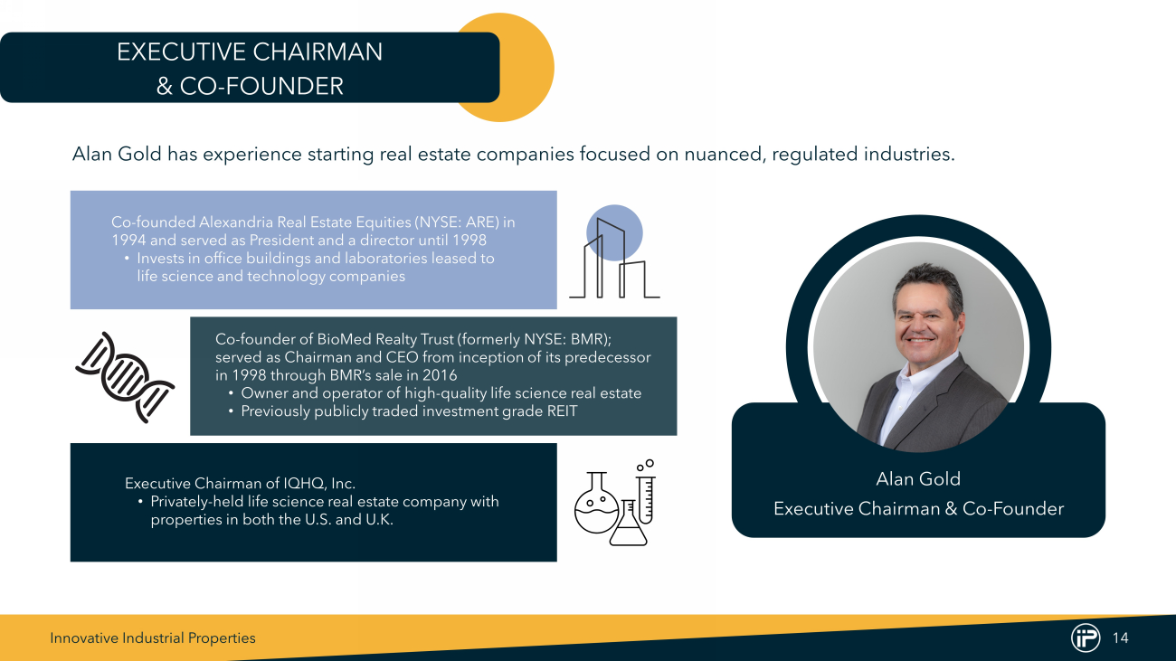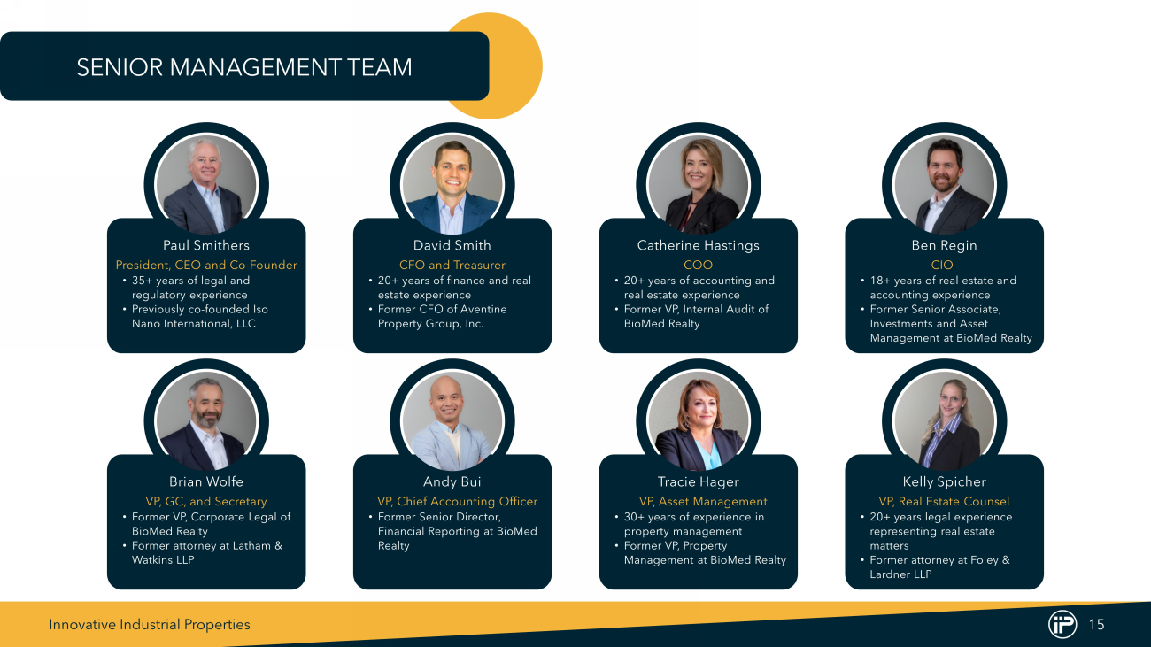 Innovative Industrial Properties 14 EXECUTIVE CHAIRMAN & CO - FOUNDER Alan Gold Executive Chairman & Co - Founder Co - founder of BioMed Realty Trust (formerly NYSE: BMR); served as Chairman and CEO from inception of its predecessor in 1998 through BMR’s sale in 2016 • Owner and operator of high - quality life science real estate • Previously publicly traded investment grade REIT Co - founded Alexandria Real Estate Equities (NYSE: ARE) in 1994 and served as President and a director until 1998 • Invests in office buildings and laboratories leased to life science and technology companies Executive Chairman of IQHQ, Inc. • Privately - held life science real estate company with properties in both the U.S. and U.K. Alan Gold has experience starting real estate companies focused on nuanced, regulated industries.