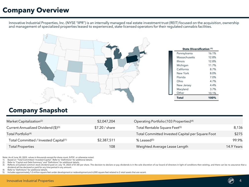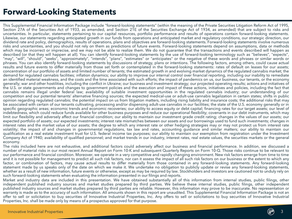Innovative Industrial Properties 3 Forward - Looking Statements This Supplemental Financial Information Package include "forward - looking statements" (within the meaning of the Private Securities Litigation Reform Act of 1995 , Section 27 A of the Securities Act of 1933 , as amended, and Section 21 E of the Securities Exchange Act of 1934 , as amended) that are subject to risks and uncertainties . In particular, statements pertaining to our capital resources, portfolio performance and results of operations contain forward - looking statements . Likewise, our statements regarding anticipated growth in our funds from operations and anticipated market and regulatory conditions, our strategic direction, our dividend rate and policy, demographics, results of operations, plans and objectives are forward - looking statements . Forward - looking statements involve numerous risks and uncertainties, and you should not rely on them as predictions of future events . Forward - looking statements depend on assumptions, data or methods which may be incorrect or imprecise, and we may not be able to realize them . We do not guarantee that the transactions and events described will happen as described (or that they will happen at all) . You can identify forward - looking statements by the use of forward - looking terminology such as "believes“, "expects“, "may“, "will“, "should“, "seeks“, "approximately“, "intends“, "plans“, "estimates" or "anticipates" or the negative of these words and phrases or similar words or phrases . You can also identify forward - looking statements by discussions of strategy, plans or intentions . The following factors, among others, could cause actual results and future events to differ materially from those set forth or contemplated in the forward - looking statements : rates of default on leases for our assets ; concentration of our portfolio of assets and limited number of tenants ; the estimated growth in and evolving market dynamics of the regulated cannabis market ; the demand for regulated cannabis facilities ; inflation dynamics ; our ability to improve our internal control over financial reporting, including our inability to remediate an identified material weakness, and the costs and the time associated with such efforts ; the impact of pandemics on us, our business, our tenants, or the economy generally ; war and other hostilities, including the conflict in Ukraine ; our business and investment strategy ; our projected operating results ; actions and initiatives of the U . S . or state governments and changes to government policies and the execution and impact of these actions, initiatives and policies, including the fact that cannabis remains illegal under federal law ; availability of suitable investment opportunities in the regulated cannabis industry ; our understanding of our competition and our potential tenants’ alternative financing sources ; the expected medical - use or adult - use cannabis legalization in certain states ; shifts in public opinion regarding regulated cannabis ; the potential impact on us from litigation matters, including rising liability and insurance costs ; the additional risks that may be associated with certain of our tenants cultivating, processing and/or dispensing adult - use cannabis in our facilities ; the state of the U . S . economy generally or in specific geographic areas ; economic trends and economic recoveries ; our ability to access equity or debt capital ; financing rates for our target assets ; our level of indebtedness, which could reduce funds available for other business purposes and reduce our operational flexibility ; covenants in our debt instruments, which may limit our flexibility and adversely affect our financial condition ; our ability to maintain our investment grade credit rating ; changes in the values of our assets ; our expected portfolio of assets ; our expected investments ; interest rate mismatches between our assets and our borrowings used to fund such investments ; changes in interest rates and the market value of our assets ; the degree to which any interest rate or other hedging strategies may or may not protect us from interest rate volatility ; the impact of and changes in governmental regulations, tax law and rates, accounting guidance and similar matters ; our ability to maintain our qualification as a real estate investment trust for U . S . federal income tax purposes ; our ability to maintain our exemption from registration under the Investment Company Act of 1940 ; availability of qualified personnel ; and market trends in our industry, interest rates, real estate values, the securities markets or the general economy . The risks included here are not exhaustive, and additional factors could adversely affect our business and financial performance . In addition, we discussed a number of material risks in our most recent Annual Report on Form 10 - K and subsequent Quarterly Reports on Form 10 - Q . Those risks continue to be relevant to our performance and financial condition . Moreover, we operate in a very competitive and rapidly changing environment . New risk factors emerge from time to time and it is not possible for management to predict all such risk factors, nor can it assess the impact of all such risk factors on our business or the extent to which any factor, or combination of factors, may cause actual results to differ materially from those contained in any forward - looking statements . Any forward - looking statement made by us speaks only of the date on which we make it . We undertake no obligation to publicly update or revise any forward - looking statements, whether as a result of new information, future events or otherwise, except as may be required by law . Stockholders and investors are cautioned not to unduly rely on such forward - looking statements when evaluating the information presented in our filings and reports . Market and industry data are incl