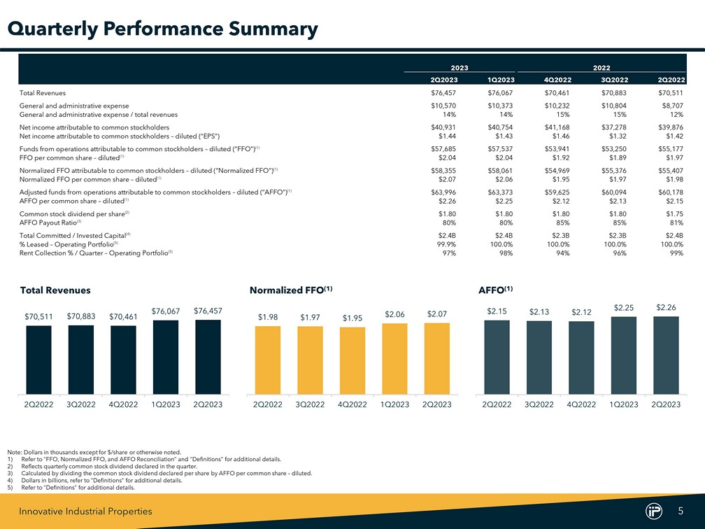 Innovative Industrial Properties 4 Company Snapshot State Diversification (1) Pennsylvania 16.1% Massachusetts 12.8% Illinois 12.8% Michigan 11.7% California 8.7% New York 8.0% Florida 7.0% Ohio 4.7% New Jersey 4.4% Maryland 3.7% Other 10.1% Total 100% Company Overview Innovative Industrial Properties, Inc. (NYSE “IIPR”) is an internally managed real estate investment trust (REIT) focused on the acquisition, ownership and management of specialized properties leased to experienced, state - licensed operators for their regulated cannabis facilities . Note : As of June 30 , 2023 , values in thousands except for share count, $ /PSF, or otherwise noted . 1) Based on “Total Committed / Invested Capital” . Refer to “Definitions” for additional details . 2) Refer to “Capital and Debt Summary” and “Definitions” for additional details . 3) Reflects annualized common stock dividend paid on July 14 , 2023 of $ 1 . 80 per share . The decision to declare or pay dividends is in the sole discretion of our board of directors in light of conditions then existing, and there can be no assurance that a dividend will be declared or paid for any time period in any amount . 4) Refer to “Definitions” for additional details . 5) Includes approximately 1 . 0 million square feet under development or redevelopment and 6 , 000 square feet related to 2 retail assets that are vacant . Market Capitalization (2) $2,047,204 Operating Portfolio (103 Properties) (4) Current Annualized Dividend ($) (3) $7.20 / share Total Rentable Square Feet (5) 8,136 Total Portfolio (4) Total Committed Invested Capital per Square Foot $275 Total Committed / Invested Capital (1) $2,387,511 % Leased (5) 99.9% Total Properties 108 Weighted Average Lease Length 14.9 Years