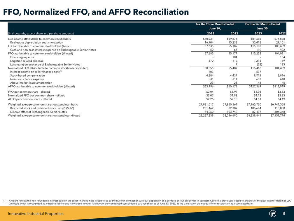 Innovative Industrial Properties 7 For the Three Months Ended For the Six Months Ended June 30, June 30, (In thousands, except share and per share amounts) 2023 2022 2023 2022 Revenues: Rental (including tenant reimbursements) $75,919 $69,995 $151,448 $134,109 Other 538 516 1,076 906 Total revenues 76,457 70,511 152,524 135,015 Expenses: Property expenses 5,759 2,427 11,382 4,409 General and administrative expense 10,570 8,707 20,943 17,484 Depreciation and amortization expense 16,704 15,233 33,418 29,101 Total expenses 33,033 26,367 65,743 50,994 Income from operations 43,424 44,144 86,781 84,021 Interest and other income 2,317 581 4,550 638 Interest expense (4,472) (4,504) (8,992) (9,270) (Loss) gain on exchange of Exchangeable Senior Notes - (7) 22 (125) Net income 41,269 40,214 82,361 75,264 Preferred stock dividends (338) (338) (676) (676) Net income attributable to common stockholders $40,931 $39,876 $81,685 $74,588 Net income attributable to common stockholders per share: Basic $1.45 $1.42 $2.89 $2.77 Diluted $1.44 $1.42 $2.87 $2.75 Weighted-average shares outstanding: Basic 27,981,517 27,850,561 27,965,720 26,741,568 Diluted 28,257,239 28,036,690 28,239,841 27,159,774 Net Income