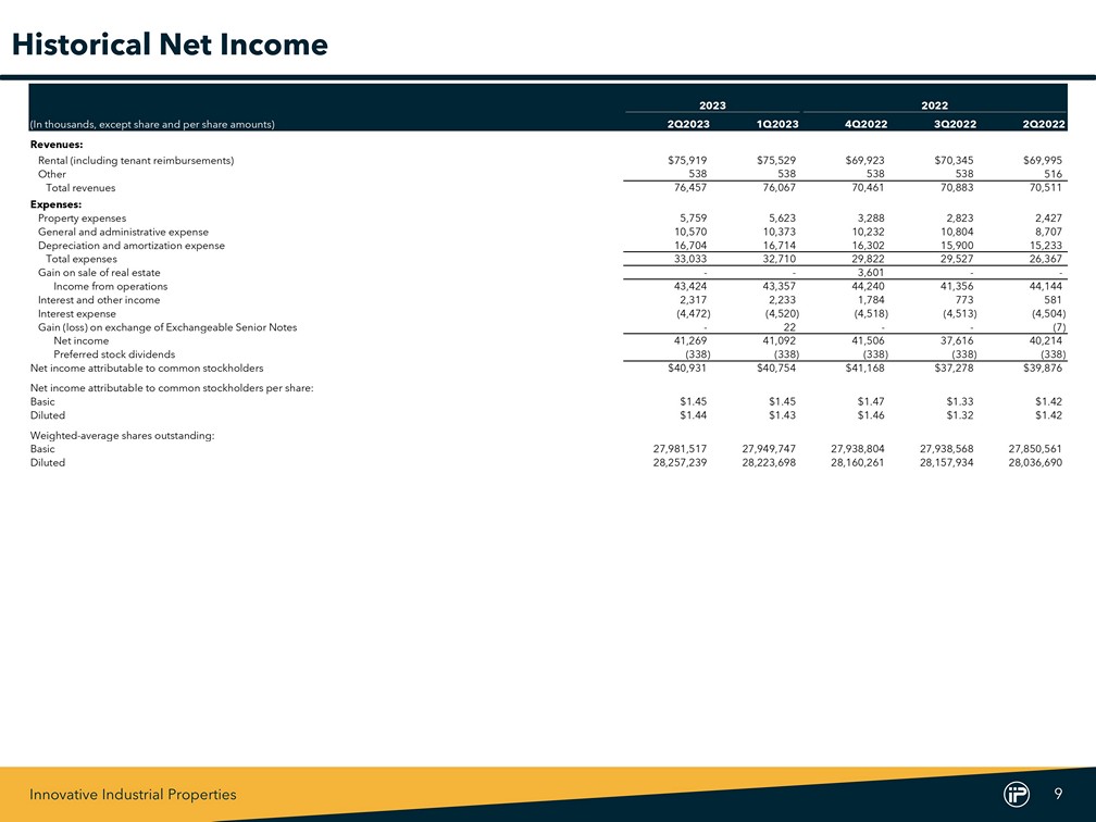 Innovative Industrial Properties 9 2023 2022 (In thousands, except share and per share amounts) 2Q2023 1Q2023 4Q2022 3Q2022 2Q2022 Revenues: Rental (including tenant reimbursements) $75,919 $75,529 $69,923 $70,345 $69,995 Other 538 538 538 538 516 Total revenues 76,457 76,067 70,461 70,883 70,511 Expenses: Property expenses 5,759 5,623 3,288 2,823 2,427 General and administrative expense 10,570 10,373 10,232 10,804 8,707 Depreciation and amortization expense 16,704 16,714 16,302 15,900 15,233 Total expenses 33,033 32,710 29,822 29,527 26,367 Gain on sale of real estate - - 3,601 - - Income from operations 43,424 43,357 44,240 41,356 44,144 Interest and other income 2,317 2,233 1,784 773 581 Interest expense (4,472) (4,520) (4,518) (4,513) (4,504) Gain (loss) on exchange of Exchangeable Senior Notes - 22 - - (7) Net income 41,269 41,092 41,506 37,616 40,214 Preferred stock dividends (338) (338) (338) (338) (338) Net income attributable to common stockholders $40,931 $40,754 $41,168 $37,278 $39,876 Net income attributable to common stockholders per share: Basic $1.45 $1.45 $1.47 $1.33 $1.42 Diluted $1.44 $1.43 $1.46 $1.32 $1.42 Weighted-average shares outstanding: Basic 27,981,517 27,949,747 27,938,804 27,938,568 27,850,561 Diluted 28,257,239 28,223,698 28,160,261 28,157,934 28,036,690 Historical Net Income